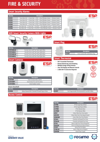 545FIRE & SECURITYTogether we GENERATE VALUESmart Security AlarmsWifi Smart Security Camera With LightsSmart DoorbellSmart CamerasAccess ControlSmart Thermostat%u2022 Wi-Fi Controlled Thermostat%u2022 Remote Monitoring and Scheduling%u2022 Multiple Energy Saving Features%u2022 Clear LED Display and Manual Controls%u2022 2.4GHz Wi-Fi Connection Required POWERED BYCLICK SMART+Smart PlugPart No. DescriptionECSPK1 Smart Alarm Kit - 1 x Smart hub, 1 x PIR, 1 x Door/Window Contact, 1 x Remote ControlECSPK2 Smart Alarm Kit - 1 x Smart hub, 2 x PIR, 1 x Door/Window Contact, 1 x Remote ControlECSPK3 Smart Alarm Kit - 1 x Smart hub, 3 x PIR, 2 x Door/Window Contact, 2 x Remote ControlECSPK4 Smart Alarm Kit - 1 x Smart hub, 4 x PIR, 2 x Door/Window Contact, 2 x Remote ControlECSPK5 Smart Alarm Kit - 1 x Smart hub, 1 x Pet PIR, 1 x Door/Window Contact, 1 x Remote ControlECSPK6 Smart Alarm Kit - 1 x Smart hub, 2 x Pet PIR, 2 x Door/Window Contact, 2 x Remote ControlPart No. DescriptionECSPCAMSLW Security Camera with Twin Spots Lights WhiteECSPCAMSLB Security Camera with Twin Spots Lights BlackECSPCAMFLW Security Camera with Twin Flood Lights WhiteECSPCAMFLB Security Camera with Twin Flood Lights BlackPart No. DescriptionECSPCAM Smart Security Indoor CameraECSPCAMPT Smart Indoor Pan and Tilt CameraECSPCAM65 Smart Outdoor CameraPart No. DescriptionECSPDB Battery Powered WI-FI Doorbell IP54 with Plug-in ChimePart No. DescriptionECSPST Fort Programmable Thermostat with RF and Wi-Fi WhitePart No. DescriptionECSPSP Smart Controls WiFi USB & Mains PlugPart No. DescriptionA1IPKB IP PoE Single Way Kit BlackA1IPKW IP PoE Single Way Kit WhiteA1IPMB IP PoE Monitor BlackA1IPMW IP PoE Monitor WhiteAPKIT Colour Video Door Entry SystemAPKITKP Colour Video Door Entry Keypad SystemAPMONW Colour Video Door Entry MonitorEZTAG3 Proximity and Keypad Door EntryEZTAG3B Proximity and Keypad Door EntryEZT3K Aperta Single Door Internal Keypad KitEVEXITM Push to Exit Mushroom Release ButtonA1EXIT Aperta Flush Exit ButtonA1ML250 Aperta 250kg Internal MaglockEVBPSBB Boxed Power Supply