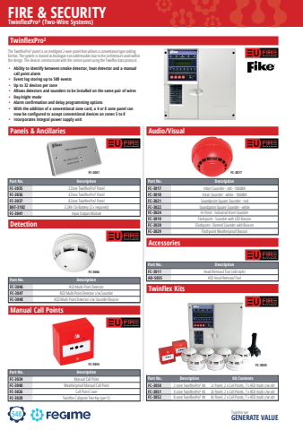 548FIRE & SECURITYTogether we GENERATE VALUEfikeTwinflexPro%u00b2 (Two-Wire Systems)TwinflexPro%u00b2%u2022 Ability to identify between smoke detector, heat detector and a manual call point alarm%u2022 Event log storing up to 500 events%u2022 Up to 32 devices per zone%u2022 Allows detectors and sounders to be installed on the same pair of wires%u2022 Day/night mode%u2022 Alarm confirmation and delay programming options%u2022 With the addition of a conventional zone card, a 4 or 8 zone panel can now be configured to accept conventional devices on zones 5 to 8%u2022 Incorporates Integral power supply unitThe Twinfl exPro%u00b2 panel is an intelligent 2-wire panel that utilises a conventional type cabling format. The system is classed as Analogue non-addressable due to the architecture used within the design. The devices communicate with the control panel using the Twinfl ex data protocol.Panels & AncillariesPart No. DescriptionFC-3035 2 Zone Twinfl exPro%u00b2 PanelFC-3036 4 Zone Twinfl exPro%u00b2 PanelFC-3037 8 Zone Twinfl exPro%u00b2 PanelBAT-3102 3.2Ah 12v Battery (2 x required)FC-3041 Input Output ModuleDetectionPart No. DescriptionFC-3046 ASD Multi-Point DetectorFC-3047 ASD Multi-Point Detector c/w SounderFC-3048 ASD Multi-Point Detector c/w Sounder BeaconManual Call PointsPart No. DescriptionFC-3034 Manual Call PointFC-3040 Weatherproof Manual Call PointFC-3026 Call Point CoverFC-3028 Twinfl ex Callpoint Test Key (per 5)Audio/VisualPart No. DescriptionFC-3017 Hitari Sounder - red - 100dBAFC-3018 Hitari Sounder - white - 100dBAFC-3021 Soundpoint Square Sounder - redFC-3022 Soundpoint Square Sounder - whiteFC-3024 Hi-Point - Industrial Horn SounderFC-3019 Flashpoint - Sounder with LED BeaconFC-3020 Flashpoint - Domed Sounder with BeaconFC-3029 Flashpoint Weatherproof BeaconAccessoriesPart No. DescriptionFC-3011 Head Removal Tool (old style)AD-5035 ASD Head Removal ToolTwinflex KitsPart No. Description Kit ContentsFC-3050 2 zone Twinfl exPro%u00b2 Kit 2z Panel, 2 x Call Points, 7 x ASD multi c/w sdrFC-3051 4 zone Twinfl exPro%u00b2 Kit 4z Panel, 2 x Call Points, 7 x ASD multi c/w sdrFC-3052 8 zone Twinfl exPro%u00b2 Kit 8z Panel, 2 x Call Points, 7 x ASD multi c/w sdrFC-3041FC-3046FC-3034 FC-3050FC-3017