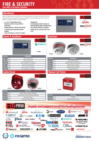550FIRE & SECURITYTogether we GENERATE VALUEalarm sense alarmsenseTwo-Wire Fire Alarm SystemsAlarmSense%u2022 2, 4, 8 or 12 AlarmSense zones%u2022 Activate controls via key switch or code entry%u2022 Integral detector removal monitoring%u2022 2 conventional monitored sounder outputs%u2022 2 Aux C/O relays (1 x Fire) (1 x Fault). voltage free%u2022 Conventional sounder circuits are fused @ 500mA with resettable fuses%u2022 Fire & fault switched -ve outputs%u2022 Disable zones, sounder O/Ps & aux O/PsQuality, reliability, ease of use and feature rich are attributes that are consistent across Haes AlarmSense range of fi re alarm control panels. The panels are designed to work with Apollo%u2019s AlarmSense range of detectors, call points, sounders and visual indicators.Panels & AncillariesPart No. DescriptionAS-5000 2 Zone Control PanelAS-5001 4 Zone Control PanelBAT-3102 3.2Ah 12v Battery (2 x required)AS-5002 Plus 8 Zone Control PanelAS-5003 Plus 12 Zone Control PanelBAT-3103 7Ah 12v Battery (2 x required)Manual Call PointsDetectionAudio/VisualPart No. DescriptionSD-6007 Optical Smoke DetectorSD-6008 Integrated Optical Smoke DetectorSD-6009 Standard Heat A1 DetectorSD-6010 High Temp Heat CS DetectorSD-6011 Base with RemovAlertPart No. DescriptionSD-6022 Call PointAD-2070 Call Point Protective CoverPart No. DescriptionSD-6014 Sounder Base for Detector MountingSD-6015 Sounder/Beacon Base for Detector MountingSD-6018 Open Area SounderSD-6019 Open Area Sounder BeaconAS-5000SD-6019 SD-6015SD-6000 SD-6009SD-6022Supply and support on all the leading brandsAND MORE...