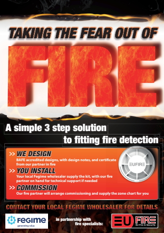 TAKING THE FEAR OUT OFContact WE DESIGNCOMMISSIONA simple 3 step solutionto fitting fire detectionBAFE accredited designs, with design notes, and certificate from our partner in fireOur fire partner will arrange commissioning and supply the zone chart for youCONTACT YOUR LOCAL FEGIME WHOLESALER FOR DETAILSin partnership withfire specialists:YOU INSTALLYour local Fegime wholesaler supply the kit, with our fire partner on hand for technical support if needed