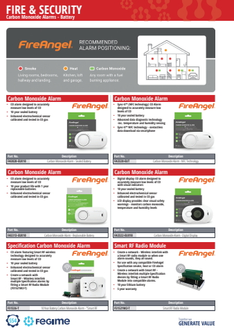 554FIRE & SECURITYTogether we GENERATE VALUECarbon Monoxide Alarms - BatteryCarbon Monoxide AlarmCarbon Monoxide AlarmPart No. DescriptionFA3313-EUX10 Carbon Monoxide Alarm - Replaceable BatterySpecification Carbon Monoxide AlarmPart No. DescriptionFS1326-T 10 Year Battery Carbon Monoxide Alarm - *Smart RFCarbon Monoxide AlarmPart No. DescriptionFA3328-EUT Carbon Monoxide Alarm - NFC TechnologyCarbon Monoxide AlarmPart No. DescriptionFA3322-EUX10 Carbon Monoxide Alarm - Digital DisplaySmart RF Radio ModulePart No. DescriptionFS1521W2-T Smart RF Radio Modulefire angel fireangel fire angel fireangelfire angel fireangel fire angel fireangelfire angel fireangel fire angel fireangel%u2022 CO alarm designed to accurately measure low levels of CO%u2022 10 year sealed battery %u2022 Enhanced electrochemical sensor calibrated and tested in CO gas%u2022 Sync-It%u2122 (NFC technology) CO Alarm designed to accurately measure low levels of CO%u2022 10 year sealed battery%u2022 Advanced data diagnostic technology -inc. temperature and humidity sensing %u2022 Sync-It%u2122 NFC technology - contactless data download via smartphone%u2022 CO alarm designed to accurately measure low levels of CO%u2022 10 year product life with 1 year replaceable batteries%u2022 Enhanced electrochemical sensor calibrated and tested in CO gas%u2022 Digital display CO alarm designed to accurately measure low levels of CO with visual indicators%u2022 10 year sealed battery %u2022 Enhanced electrochemical sensor calibrated and tested in CO gas%u2022 LCD display provides clear visual safety warnings - monitors carbon monoxide, temperature and humidity levels %u2022 CO alarm featuring Smart RF wireless technology designed to accurately measure low levels of CO%u2022 10 year sealed battery %u2022 Enhanced electrochemical sensor calibrated and tested in CO gas%u2022 Create a network withSmart RF - Wireless interlink multiple Specification alarms by fitting a Smart RF Radio Module (FS1521W2-T) %u2022 Create a network - Wireless interlink with a Smart RF radio module so when one alarm sounds, they all sound.%u2022 For use with any compatible FireAngel Specification smoke, heat or CO alarm %u2022 Create a network with Smart RF - Wireless interlink multiple Specification devices by fitting a Smart RF Radio Module into compatible alarms. %u2022 10 year lithium battery%u2022 5 year warrantyPart No. DescriptionFA3820-EUX10 Carbon Monoxide Alarm - Sealed Battery