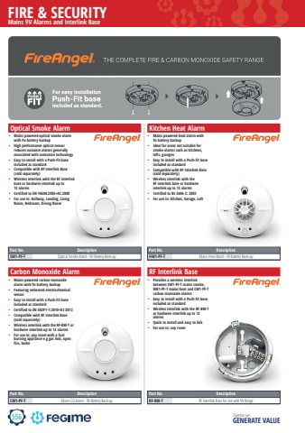 556FIRE & SECURITYTogether we GENERATE VALUEMains 9V Alarms and Interlink BaseOptical Smoke AlarmPart No. DescriptionSW1-PF-T Optical Smoke Alarm - 9V Battery Back-upCarbon Monoxide AlarmPart No. DescriptionCW1-PF-T Mains CO Alarm - 9V Battery Back-upKitchen Heat AlarmPart No. DescriptionHW1-PF-T Mains Heat Alarm - 9V Battery Back-upRF Interlink BasePart No. DescriptionRF-BW-T RF Interlink Base for use with 9V Rangefire angel fireangel fire angel fireangelfire angel fireangel fire angel fireangel%u2022 Mains powered optical smoke alarm with 9v battery backup%u2022 High performance optical sensor reduces nuisance alarms generally associated with ionisation technology%u2022 Easy to install with a Push-Fit base included as standard%u2022 Compatible with RF Interlink Base (sold separately)%u2022 Wireless interlink with the RF interlink base or hardwire interlink up to 12 alarms%u2022 Certified to EN 14604:2005+AC:2008%u2022 For use in: Hallway, Landing, Living Room, Bedroom, Dining Room%u2022 Mains powered carbon monoxide alarm with 9v battery backup%u2022 Featuring enhanced electrochemical sensor%u2022 Easy to install with a Push-Fit base included as standard%u2022 Certified to EN 50291-1:2010+A1:2012%u2022 Compatible with RF Interlink Base (sold separately)%u2022 Wireless interlink with the RF-BW-T or hardwire interlink up to 12 alarms%u2022 For use in: any room with a fuel burning appliance e.g gas hob, open fire, boiler%u2022 Mains powered heat alarm with 9v battery backup%u2022 Ideal for areas not suitable for smoke alarms such as kitchens, lofts, garages%u2022 Easy to install with a Push-Fit base included as standard%u2022 Compatible with RF Interlink Base (sold separately)%u2022 Wireless interlink with the RF interlink base or hardwire interlink up to 12 alarms%u2022 Certified to BS 5446-2: 2003%u2022 For use in: Kitchen, Garage, Loft%u2022 Provides a wireless interlink between SW1-PF-T mains smoke, HW1-PF-T mains heat and CW1-PF-T carbon monoxide alarms%u2022 Easy to install with a Push-Fit base included as standard%u2022 Wireless interlink with the RF-BW-T or hardwire interlink up to 12 alarms%u2022 Quick to install and easy to link%u2022 For use in: any room