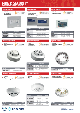 558FIRE & SECURITYTogether we GENERATE VALUEfire sense firesenseConventional Panels & DevicesKentec Panels%u2022 EN54-2&4%u2022 Also available as Twin wire versionApollo Detectors%u2022 9-33VDC%u2022 Can be used on security systemsHochiki Detectors%u2022 12-30VDC%u2022 IP42%u2022 Available in Ivory or BlackHochiki Bases%u2022 Accepts 2.5mm cable%u2022 Also available in IvoryHochiki Detectors%u2022 12-30VDC%u2022 IP42%u2022 Available in Ivory or BlackApollo Bases%u2022 9-33VDC%u2022 Can be used on security systemsC-TEC Panels%u2022 EN54-2&4%u2022 Four sounder circuitsHaes Panels%u2022 EN54-2&4%u2022 Twin wire selection by DIL Switch%u2022 Excel version networkableApollo Detectors%u2022 9-33VDC%u2022 Can be used on security systemsPart No. DescriptionKL11020M2 Kentec 2 Zone PanelKL11040M2 Kentec 4 Zone PanelKL11080M2 Kentec 8 Zone PanelPart No. Description55000-317APO Optical Smoke DetectorPart No. Description ColourSOC-E3N(WHT) Photoelectric Smoke WhitePart No. Description ColourYBN-R/6SK(WHT) Schotty Diode Base WhitePart No. Description ColourDCD-AE3(WHT) 60%u00b0C Heat WhiteDFJ-AE3(WHT) 60%u00b0C Fixed Temperature HeatWhiteDCD-CE3(WHT) 90%u00b0C Heat WhiteDFJ-CE3(WHT) 90%u00b0C Fixed Temperature HeatWhitePart No. Description45681-201APO Detector Mounting Base with DiodePart No. DescriptionCFP702-4 CTEC CFP 2 Zone PanelCFP704-4 CTEC CFP 4 Zone PanelCFP708-4 CTEC CFP 8 Zone PanelPart No. DescriptionECL-2 Haes Eclipse 2 Zone PanelECL-4 Haes Eclipse 4 Zone PanelXLEN-6 Haes Excel 6 Zone PanelXLEN-8 Haes Excel 8 Zone PanelXLEN-12 Haes Excel 12 Zone PanelPart No. Description55000-122APO A1R 57%u00b0C Rate of Rise Heat Detector55000-127APO BR 75%u00b0C Rate of Rise Heat Detector55000-132APO CR 90%u00b0C Rate of Rise Heat Detector55000-137APO CS 90%u00b0C Static Heat Detector