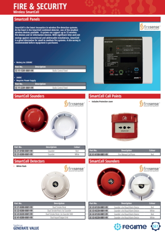 561FIRE & SECURITYTogether we GENERATE VALUEWireless SmartCellSmartcell PanelsSmartCell Detectors%u2022 White FlashSmartCell Sounders SmartCell Call Points%u2022 Includes Protective coverSmartCell SoundersPart No. DescriptionSC-11-1201-0001-99 Radio Control PanelPart No. DescriptionSC-11-2201-0001-99 Radio Control PanelPart No. DescriptionSC-21-0200-0001-99 Dual Smoke/HeatSC-22-0200-0001-99 Dual Smoke/Heat c/w SounderSC-23-0220-0001-99 Dual Smoke/Heat c/w Sounder VADSC-41-0200-0001-99 Dual Input/Output UnitPart No. Description ColourSC-31-0100-0001-99 Sounder RedSC-31-0200-0001-99 Sounder WhitePart No. Description ColourSC-51-0100-0001-99 Fire Manual Call Point RedPart No. Description ColourSC-33-0120-0001-99 Sounder c/w Visual Alarm Device RedSC-33-0220-0001-99 Sounder c/w Visual Alarm Device WhiteSC-32-0120-0001-99 Sounder c/w Visual Alarm Device RedSC-32-0220-0001-99 Sounder c/w Visual Alarm Device White%u2022 Battery inc 230VAC%u2022 24VDC%u2022 Requires Power SupplySmartCell is the latest innovation in wireless fi re detection systems. At the heart is the SmartCell combined detector, one of the smallest wireless devices available. A system can support up to 32 wireless fi re devices and 32 information devices. With signifi cant time and cost savings against conventional and addressable installations, SmartCell is a great alternative for small to medium fi re systems. A site survey is recommended before equipment is purchased.
