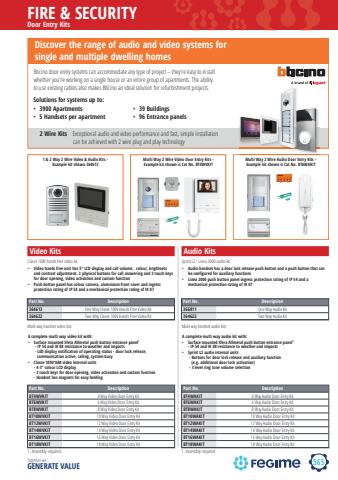 565FIRE & SECURITYTogether we GENERATE VALUEbticinoDoor Entry Kits%u2022 Video hands free unit has 5%u201d LCD display and call volume, colour, brightness and contrast adjustment. 2 physical buttons for call answering and 3 touch keys for door opening, video activation and custom function%u2022 Push button panel has colour camera, aluminium front cover and ingress protection rating of IP 54 and a mechanical protection rating of IK 07Classe 100V hands free video kit.Bticino door entry systems can accommodate any type of project %u2013 they%u2019re easy to install whether you%u2019re working on a single house or an entire group of apartments. The ability to use existing cables also makes Bticino an ideal solution for refurbishment projects.Discover the range of audio and video systems for single and multiple dwelling homesSolutions for systems up to: %u2022 3900 Apartments%u2022 5 Handsets per apartment%u2022 39 Buildings%u2022 96 Entrance panels2 Wire Kits Exceptional audio and video performance and fast, simple installation can be achieved with 2 wire plug and play technologyVideo KitsPart No. Description364613 One Way Classe 100V Hands Free Video Kit364622 Two Way Classe 100V Hands Free Video KitA complete multi way video kit with:%u2022 Surface mounted Sfera Allmetal push button entrance panel1 - IP 54 and IK 08 resistance to weather and impacts - LED display notification of operating status - door lock release, communication active, calling, system busy%u2022 Classe 100V16M video internal units - 4%u00b73%u201d colour LCD display- 3 touch keys for door opening, video activation and custom function- Handset has magnets for easy holdingMulti way handset video kitsPart No. DescriptionBT4WVKIT 4 Way Video Door Entry KitBT6WVKIT 6 Way Video Door Entry KitBT8WVKIT 8 Way Video Door Entry KitBT10WVKIT 10 Way Video Door Entry KitBT12WVKIT 12 Way Video Door Entry KitBT14WVKIT 14 Way Video Door Entry KitBT16WVKIT 16 Way Video Door Entry KitBT18WVKIT 18 Way Video Door Entry Kit%u2022 Audio handset has a door lock release push button and a push button that can be configured for auxiliary functions%u2022 Linea 2000 push button panel ingress protection rating of IP 54 and a mechanical protection rating of IK 07Sprint L2 - Linea 2000 audio kit.Audio KitsPart No. Description366811 One Way Audio Kit364622 Two Way Audio KitA complete multi way audio kit with:%u2022 Surface mounted Sfera Allmetal push button entrance panel1- IP 54 and IK 08 resistance to weather and impacts%u2022 Sprint L2 audio internal units - Buttons for door lock release and auxiliary function (e.g. additional door lock activation) - 3 level ring tone volume selectionMulti way handset audio kitsPart No. DescriptionBT4WAKIT 4 Way Audio Door Entry KitBT6WAKIT 6 Way Audio Door Entry KitBT8WAKIT 8 Way Audio Door Entry KitBT10WAKIT 10 Way Audio Door Entry KitBT12WAKIT 12 Way Audio Door Entry KitBT14WAKIT 14 Way Audio Door Entry KitBT16WAKIT 16 Way Audio Door Entry KitBT18WAKIT 18 Way Audio Door Entry Kit1 & 2 Way 2 Wire Video & Audio Kits - Example kit shown 364613Multi Way 2 Wire Video Door Entry Kits -Example kit shown is Cat No. BT4WVKITMulti Way 2 Wire Audio Door Entry Kits -Example kit shown is Cat No. BT6WAKIT1 : Assembly required 1 : Assembly required