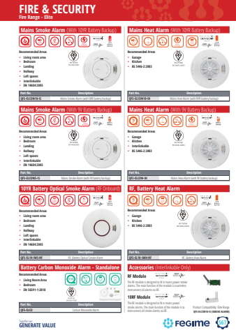 567FIRE & SECURITYTogether we GENERATE VALUERecommended Areas%u2022 Living Room Area%u2022 Bedroom%u2022 EN 50291-1:2018Fire Range - EliteMains Smoke Alarm (With 10YR Battery Backup)Part No. DescriptionQFS-ELCON10-IS Mains Smoke Alarm (with10YR battery backup)Recommended Areas%u2022 Living room area%u2022 Bedroom%u2022 Landing%u2022 Hallway%u2022 Loft spaces%u2022 Interlinkable%u2022 EN 14604:2005Mains Smoke Alarm (With 9V Battery Backup)Part No. DescriptionQFS-ELCON5-IS Mains Smoke Alarm (with 9V battery backup)Recommended Areas%u2022 Living room area%u2022 Bedroom%u2022 Landing%u2022 Hallway%u2022 Loft spaces%u2022 Interlinkable%u2022 EN 14604:2005Mains Heat Alarm (With 9V Battery Backup)Part No. DescriptionQFS-ELCON-IH Mains Heat Alarm (with 9V battery backup)Recommended Areas%u2022 Garage%u2022 Kitchen%u2022 Interlinkable%u2022 BS 5446-2:200310YR Battery Optical Smoke Alarm (RF Onboard)Part No. DescriptionQFS-EL10-IWS-RF RF, Battery Optical Smoke AlarmRecommended Areas%u2022 Living room area%u2022 Bedroom%u2022 Landing%u2022 Hallway%u2022 Loft spaces%u2022 Interlinkable%u2022 EN 14604:2005RF, Battery Heat AlarmPart No. DescriptionQFS-EL10-IWH-RF RF, Battery Heat AlarmRecommended Areas%u2022 Garage%u2022 Kitchen%u2022 BS 5446-2:2003Battery Carbon Monoxide Alarm - Standalone Accessories (Interlinkable Only)Part No. DescriptionQFS-ELCO Carbon Monoxide Alarm Product Compatibility: Elite RangeQFS-ELCON10-IS (SMOKE ALARM)RF ModuleThe RF module is designed to fit in mains power smoke alarms. The main function of the module is to wireless interconnect all alarms via RF.10RF ModuleThe RF module is designed to fit in mains power smoke alarms. The main function of the module is to interconnect all smoke alarms via RF.Mains Heat Alarm (With 10YR Battery Backup)Recommended Areas%u2022 Garage%u2022 Kitchen%u2022 BS 5446-2:2003Part No. DescriptionQFS-ELCON10-IH Mains Heat Alarm (with10YR battery backup)