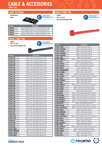 57CABLE & ACCESSORIESTogether we GENERATE VALUEtermination technology ltd, TermtechCable TiesCable Tie BasesPart No. DescriptionCTBV20N Natural Self Adhesive Base, 20 x 20 with Fixing Hole Unit 100CTBV20B Black Self Adhesive Base, 20 x 20 with Fixing Hole Unit 100CTBV25B Black Self Adhesive Base, 28 x 28 with Fixing Hole Unit 100CTBV25N Natural Self Adhesive Base, 28 x 28 with Fixing Hole Unit 100%u2022 Self Adhesive%u2022 NylonNylon Cable TiesPart No. DescriptionTT100-2.5B 100mm Long, 2.5mm Wide, Black unit 100TT100-2.5N 100mm Long, 2.5mm Wide, Natural unit 100TT140-3.6B 140mm Long, 3.6mm Wide, Black unit 100TT140-3.6N 140mm Long, 3.6mm Wide, Natural unit 100TT160-2.5B 160mm Long, 2.5mm Wide, Black unit 100TT160-2.5N 160mm Long, 2.5mm Wide, Natural unit 100TT160-4.8B 160mm Long, 4.8mm Wide, Black unit 100TT160-4.8N 160mm Long, 4.8mm Wide, Natural unit 100TT200-2.5B 200mm Long, 2.5mm Wide, Black unit 100TT200-2.5N 200mm Long, 2.5mm Wide, Natural unit 100TT200-3.6B 200mm Long, 3.6mm Wide, Black unit 100TT200-3.6N 200mm Long, 3.6mm Wide, Natural unit 100TT200-4.8B 200mm Long, 4.8mm Wide, Black unit 100TT200-4.8N 200mm Long, 4.8mm Wide, Natural unit 100TT250-4.8B 250mm Long, 4.8mm Wide, Black unit 100TT250-4.8N 250mm Long, 4.8mm Wide, Natural unit 100TT300-3.6B 300mm Long, 3.6mm Wide, Black unit 100TT300-3.6N 300mm Long, 3.6mm Wide, Natural unit 100TT300-4.8B 300mm Long, 4.8mm Wide, Black unit 100TT300-4.8N 300mm Long, 4.8mm Wide, Natural unit 100TT300-7.8B 300mm Long, 7.8mm Wide, Black unit 100TT300-7.8N 300mm Long, 7.8mm Wide, Natural unit 100TT370-4.8B 370mm Long, 4.8mm Wide, Black unit 100TT370-4.8N 370mm Long, 4.8mm Wide, Natural unit 100TT370-7.8B 370mm Long, 7.8mm Wide, Black unit 100TT370-7.8N 370mm Long, 7.8mm Wide, Natural unit 100TT430-4.8B 430mm Long, 4.8mm Wide, Black unit 100TT430-4.8N 430mm Long, 4.8mm Wide, Natural unit 100TT500-12.6B 500mm Long, 12.6mm Wide, Black unit 100TT500-12.6N 500mm Long, 12.6mm Wide, Natural unit 100TT540-8.0B 540mm Long, 7.8mm Wide, Black unit 100TT540-8.0N 540mm Long, 7.8mm Wide, Natural unit 100TT750-8.0B 750mm Long, 7.8mm Wide, Black unit 100TT750-8.0N 750mm Long, 7.8mm Wide, Natural unit 100TT200-4.8RED 200mm Long, 4.8mm Wide, Red unit 100TT200-4.8BROWN 200mm Long, 4.8mm Wide, Brown unit 100TT200-4.8BLUE 200mm Long, 4.8mm Wide, Blue unit 100TT300-4.8RED 300mm Long, 4.8mm Wide, Red unit 100%u2022 UL94V2%u2022 -40%u00b0C to +85%u00b0C%u2022 Loop Tensile Strength:%u00a080NNylon Cable TiesPart No. DescriptionTT100-2.5BLUE 100mm x 2.5mm Blue Cable TieTT100-2.5BROWN 100mm x 2.5mm Brown Cable TieTT100-2.5GREEN 100mm x 2.5mm Green Cable TieTT100-2.5MARKER 100mm x 2.5mm Marker Cable TieTT100-2.5ORANGE 100mm x 2.5mm Orange Cable TieTT100-2.5RED 100mm x 2.5mm Red Cable TieTT100-2.5REDLSF 100mm x 2.5mm Red Low Smoke And Fume Cable TieTT100-2.5YEL 100mm x 2.5mm Yellow Cable TieTT150-7.8REL/B 150mm x 7.8mm Releasable Cable TieTT200-4.8B-MH 200mm x 4.8mm Blackmounted Head TieTT200-4.8BLUE 200mm x 4.8mm Blue Cable TieTT200-4.8DARKBROWN 200mm x 4.8mm Brown Cable TieTT200-4.8GREEN 200mm x 4.8mm Green Cable TieTT200-4.8MAR 200mm x 4.8mm Natural Marker Cable TieTT200-4.8N-MH 200mm x 4.8mm Natural Mounted Head Tie Cable TieTT200-4.8ORG 200mm x 4.8mm Orange Cable TieTT200-4.8PURPLE 200mm x 4.8mm Purple Cable TieTT200-4.8RED 200mm x 4.8mm Red Cable TieTT200-4.8REDLSF 200mm x 4.8mm Red Low Smoke And Fumecable TieTT200-4.8RELB 200mm x 4.8mm Black Releasable Cable TieTT200-4.8RELN 200mm x 4.8mm Natural Releasable Cable TieTT200-4.8YELL 200mm x 4.8mm Yellow Cable TieTT200-BLUEN 200mm x 4.8mm Blue Marked N (Neutral) Cable TieTT200-BROWNL 200mm x 4.8mm Brown Marked L (Live) Cable TieTT200-BROWNL1 200mm x 4.8mm Brown Marked L1 (Live) Cable TieTT200-BROWNL2 200mm x 4.8mm Brown Marked L2 (Live) Cable TieTT200-BROWNL3 200mm x 4.8mm Brown Marked L3 (Live) Cable TieTT200-PLUG-B 200mm x 4.8mm Rawl Plug Cable TieTT300-4.8B/MH 300mm x 4.8mm Black Mounted Head Tie Cable TieTT300-4.8B/STEEL/B 300mm x 4.8mm Black Steel Barb Head Tie Cable TieTT300-4.8BLUE 300mm x 4.8mm Blue Cable TieTT300-4.8BROWN 300mm x 4.8mm Brown Cable TieTT300-4.8GREEN 300mm x 4.8mm Green Cable TieTT300-4.8N/STEEL/B 300mm x 4.8mm Natural Steel Barb Head Tie Cable TieTT300-4.8ORG 300mm x 4.8mm Orange Cable TieTT300-4.8PINK 300mm x 4.8mm Pink Cable TieTT300-4.8PURPLE 300mm x 4.8mm Purple Cable TieTT300-4.8RED 300mm x 4.8mm Red Cable TieTT300-4.8REDLSF 300mm x 4.8mm Red Low Smoke And Fume Cable TieTT300-4.8RELB 300mm x 4.8mm Black Releasable Cable TieTT300-4.8RELN 300mm x 4.8mm Natural Releasable Cable TieTT300-4.8SIL 300mm x 4.8mm Silver Cable TieTT300-4.8YELL 300mm x 4.8mm Yellow Cable Tie%u2022 UL94V2%u2022 -40%u00b0C to +85%u00b0C%u2022 Loop Tensile Strength:%u00a080N