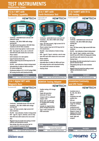 571TEST INSTRUMENTSTogether we GENERATE VALUEMultifunction Testers12-in-1 MFT with EV Testing CapabilityPart No. DescriptionKT66DL 12-in-1 MFT with EV Testing Capability%u2022 Continuity - switchable buzzer and auto null (200mA & 15mA)%u2022 Insulation - 250, 500 & 1000V with voltage warning LED%u2022 Two high current loop options: 25A 0.001 Ohm resolution & 6A 0.01 Ohm resolution%u2022 Two low current loop options: 3 wire & 2 wire%u2022 RCD - Tests Type AC, ACS, A, AS, F, B, BS & EV%u2022 Auto RCD tests with results all on one screen%u2022 Phase rotation%u2022 Earth resistance 3 & 2 wire options%u2022 Surge Protection Device test%u2022 Phase to phase loop test & 55V loop test for CTE transformers%u2022 PSC/PFC - clear indication of what is being tested%u2022 Selectable Max Zs tables for MCBs and fuses%u2022 UC contact voltage test%u2022 Simultaneous display of L-PE, L-N, N-PE voltage (TRMS)%u2022 PAT testing function with download facilityThe complete MFT7-in-1mMFT with EV & SPD testing5-in-1 digital MFT with Magnetic Base8-in-1 MFT with Earth Resistance TestPart No. DescriptionKT65DL 8-in-1 MFT with Earth Resistance Test%u2022 Continuity - switchable buzzer and auto null%u2022 Insulation - 250, 500 & 1000V with voltage warning LED%u2022 Loop - ATT (low current), high current 0.01 & 0.001 ohm resolution%u2022 Phase to phase loop test & 55V loop test for CTE transformers%u2022 PSC/PFC - clear indication of what is being tested%u2022 RCD - Type AC, Type A, selective, auto & ramp%u2022 Auto RCD tests with results all on one screen%u2022 Phase rotation%u2022 Earth resistance%u2022 Selectable Max Zs tables for MCBs and fuses%u2022 PAT testing function with download facility%u2022 Test probe with remote test button%u2022 Polarity CheckIndustrial MFT with earth resistanceThe UK%u2019s smallest MFTPart No. DescriptionKT64DL 7-in-1 MFT with EV & SPD testing%u2022 EV testing%u2022 Continuity - switchable buzzer and auto null%u2022 Insulation - 250, 500 & 1000V with voltage warning LED%u2022 SPD test%u2022 Loop - ATT (low current), high current 0.001 ohm resolution%u2022 PSC/PFC - clear indication of what is being tested%u2022 RCD - Type AC, Type A, selective, auto & ramp%u2022 6mA DC test at 0 & 180 for EV charge point testing%u2022 Auto RCD tests with results all on one screen%u2022 Polarity Check%u2022 New design ultra slim test probe tips for access to push fit connector blocks%u2022 Gold plated probe tips for more consistent readings%u2022 Magnetic base for hands free testing at metal cabinets and distribution boards%u2022 %u2022 IP54The domestic MFTPart No. DescriptionKT63DL 5-in-1 digital MFT with Magnetic BaseKEWEVA Testing Adapter Insulation/Continuity and SPD Tester%u2022 Insulation test at 50, 100, 250, 500 & 1000 V%u2022 Continuity test with audible tone%u2022 SPD test%u2022 30 K ohm continuity range for verifying extraneous conductive parts%u2022 Breakdown voltage%u2022 Magnetic hanger for clipping onto metal distribution boards%u2022 Small, light and compactPart No. DescriptionKT300DL Insulation /Continuity and SPD Tester%u2022 Enables testing of EV charge points%u2022 Single dial operation%u2022 Automatic CP check%u2022 Compact with no awkward adapter cable%u2022 Works with any MFT with EV charging point testing capabilities%u2022 Suitable for single & three phase charging equipment%u2022 Type 2 male connector for EVSE connectionPart No. DescriptionKEWEVA Universal EVSE Testing Adapter - also available separatelyKT66EVA KT66DL with KEWEVA Testing Adapter%u2022 Continuity - switchable buzzer and auto null%u2022 Insulation - 250, 500 & 1000V with voltage warning LED%u2022 Loop - ATT (low current), high current 0.01 ohm resolution%u2022 PSC/PFC - clear indication of what is being tested%u2022 RCD - Type AC, Type A, selective, auto & ramp%u2022 Auto RCD tests with results all on one screen%u2022 IP54%u2022 Magnetic base for hands free testing at metal cabinets and distribution boards%u2022 New design ultra slim test probe tips for access to push fit connector blocks