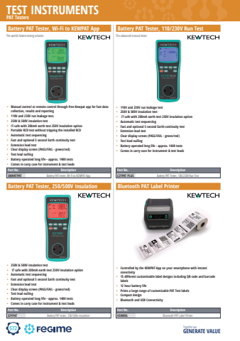 572TEST INSTRUMENTSTogether we GENERATE VALUEPart No. DescriptionSMARTPAT Battery PAT tester, Wi-Fi to KEWPAT App%u2022 Manual control or remote control through free Kewpat app for fast data collection, results and reporting%u2022 110V and 230V run leakage test.%u2022 250V & 500V insulation test%u2022 IT safe with 200mA%u00a0earth test 250V insulation option%u2022 Portable RCD test without tripping the installed RCD%u2022 Automatic test sequencing%u2022 Fast and optional 5 second Earth continuity test%u2022 Extension lead test%u2022 Clear display screen (PASS/FAIL - green/red)%u2022 Test lead nulling%u2022 Battery operated long life - approx. 1400 tests%u2022 Comes in carry case for instrument & test leads%u2022 110V and 230V run leakage test%u2022 250V & 500V insulation test%u2022 IT safe with 200mA%u00a0earth test 250V insulation option%u2022 Automatic test sequencing%u2022 Fast and optional 5 second Earth continuity test%u2022 Extension lead test%u2022 Clear display screen (PASS/FAIL - green/red)%u2022 Test lead nulling%u2022 Battery operated long life - approx. 1400 tests%u2022 Comes in carry case for instrument & test leadsPart No. DescriptionEZYPAT PLUS Battery PAT Tester, 100/230V Run TestBattery PAT Tester, 250/500V Insulation Bluetooth PAT Label PrinterPAT TestersBattery PAT Tester, Wi-Fi to KEWPAT App Battery PAT Tester, 110/230V Run TestThe worlds fastest testing solution The advanced manual testerPart No. DescriptionEZYPAT Battery PAT tester, 250/500v insulation%u2022 250V & 500V insulation test%u2022 IT safe with 200mA%u00a0earth test 250V insulation option%u2022 Automatic test sequencing%u2022 Fast and optional 5 second Earth continuity test%u2022 Extension lead test%u2022 Clear display screen (PASS/FAIL - green/red)%u2022 Test lead nulling%u2022 Battery operated long life - approx. 1400 tests%u2022 Comes in carry case for instrument & test leads%u2022 Controlled by the KEWPAT App on your smartphone with instant conectivity%u2022 15 different customisable label designs including QR code and barcode labels%u2022 12 hour battery life%u2022 Prints a large range of customisable PAT Test labels%u2022 Compact design%u2022 Bluetooth and USB ConnectivityPart No. DescriptionKEW80L Bluetooth PAT Label Printer