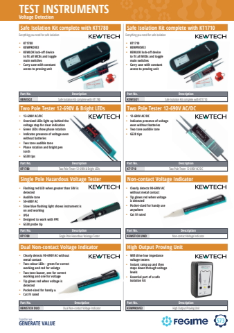 573TEST INSTRUMENTSTogether we GENERATE VALUEVoltage DetectionSafe Isolation Kit complete with KT1780Part No. DescriptionKEWISO2 Safe Isolation Kit complete with KT1780Safe Isolation Kit complete with KT1710%u2022 KT1780%u2022 KEWPROVE3%u2022 KEWLOK lock-off device to fit all MCBs and toggle main switches%u2022 Carry case with constant access to proving unit%u2022 KT1710%u2022 KEWPROVE3%u2022 KEWLOK lock-off device to fit all MCBs and toggle main switches%u2022 Carry case with constant access to proving unitPart No. DescriptionKEWISO1 Safe Isolation Kit complete with KT1710Everything you need for safe isolation Everything you need for safe isolationTwo Pole Tester 12-690V & Bright LEDsPart No. DescriptionKT1780 Two Pole Tester 12-690V & Bright LEDsTwo Pole Tester 12-690V AC/DC%u2022 12-690V AC/DC%u2022 Oversized LEDs light up behind the voltage step for clear indication%u2022 Green LEDs show phase rotation%u2022 Indicates presence of voltage even without batteries%u2022 Two tone audible tone%u2022 Phase rotation and bright pen torch%u2022 GS38 tips%u2022 12-690V AC/DC%u2022 Indicates presence of voltage even without batteries%u2022 Two tone audible tone%u2022 GS38 tipsPart No. DescriptionKT1710 Two Pole Tester 12-690V AC/DCSingle Pole Hazardous Voltage TesterPart No. DescriptionKT1700 Single Pole Hazardous Volatage TesterNon-contact Voltage Indicator%u2022 Flashing red LED when greater than 50V is detected%u2022 Audible tone%u2022 50-600V AC%u2022 Slow blue flashing light shows instrument is on and working%u2022 IP54%u2022 Designed to work with PPE%u2022 GS38 probe tip%u2022 Clearly detects 90-690V AC without metal contact%u2022 Tip glows red when voltage is detected%u2022 Pocket-sized for handy use anywhere%u2022 Cat IV ratedPart No. DescriptionKEWSTICK UNO Non-contact Voltage IndicatorDual Non-contact Voltage IndicatorPart No. DescriptionKEWSTICK DUO Dual Non-contact Voltage IndicatorHigh Output Proving Unit%u2022 Clearly detects 90-690V AC without metal contact%u2022 Two colour LEDs - green for correct working and red for volatge %u2022 Two tone buzzer, one for correct working and one for voltage%u2022 Tip glows red when voltage is detected%u2022 Pocket-sized for handy use anywhere%u2022 Cat IV rated%u2022 Will drive low impedance voltage testers %u2022 Instant ramp up and then steps%u00a0down through voltage levels%u2022 Essential part of a safe isolation kitPart No. DescriptionKEWPROVE3 High Output Proving Unit