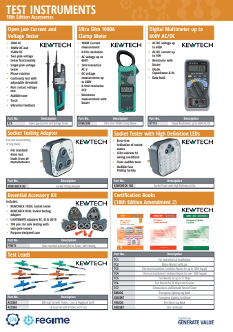 574TEST INSTRUMENTSTogether we GENERATE VALUE18th Edition AccessoriesOpen Jaw Current and Voltage TesterPart No. DescriptionKT5 Open Jaw Current and Voltage TesterUltra Slim 1000A Clamp Meter%u2022 200A AC%u2022 1000V AC and 1500V DC%u2022 Two pole voltage tester functionality%u2022 Single pole voltage tester%u2022 Phase rotation%u2022 Continuity test with adjustable threshold %u2022 Non contact voltage test%u2022 Audible tone%u2022 Torch%u2022 Vibration feedback%u2022 1000A Current measurement%u2022 0.01A resolution%u2022 AC voltage up to 600V%u2022 1mV resolution AC V%u2022 DC voltage measurement up to 600V%u2022 0.1mV resolution DCV%u2022 Resistance measurement with buzzerPart No. DescriptionKEW2200 Ultra Slim 1000A Clamp MeterSocket Tester with High Definition LEDs%u2022 Error-free indication of socket status%u2022 LEDs indicate 14 wiring conditions%u2022 Clear audible tone%u2022 Audible fuse finding facilityPart No. DescriptionKEWCHECK 103 Socket Tester with High Defi nition LEDsDigital Multimeter up to 600V AC/DCPart No. DescriptionKT115 Digital Multimeter up to 600V AC/DC%u2022 AC/DC voltage up to 600V%u2022 AC/DC current up to 10A%u2022 Resistance with buzzer%u2022 Diode, Capacitance & Hz%u2022 Data holdSocket Testing Adapter%u2022 Fits standard 4mm test leads from all manufacturersPart No. DescriptionKEWCHECK R2 Socket Testing AdapterFast and secure testing of ring mainsEssential Accessory Kit Part No. DescriptionPTKIT1 Your essential accessory kit for faster, safer testingIncludes:%u2022 KEWCHECK 103DL Socket tester%u2022 KEWCHECK R2DL Socket testing adapter%u2022 LIGHTEMATE adapters BC, ES & GU10%u2022 TP4 pins for safe testing with two-pole testers%u2022 Purpose designed caseTest LeadsCertification Books (18th Edition Amendment 2)Part No. DescriptionACC063 DB Lead Set with Probes, Crocs & Piggyback EarthACC065 CB Lead Set with Probes and CrocsPart No. DescriptionTC1 For new electrical installationsTC2 Minor Works Certifi cateTC3 Electrical Installation Condition Report for up to 100A SupplyTC4 Electrical Installation Condition Report for over 100A SupplyTC5 Test Results for up to 12 WaysTC6 Test Results for 36 Ways and GreaterTC7 Observations and Remarks Record SheetEMLOG Emergency Lighting Log BookEMCERT Emergency Lighting Certifi cateFIRLOG Fire Alarm Log BookFIRCERT Fire Certifi cate