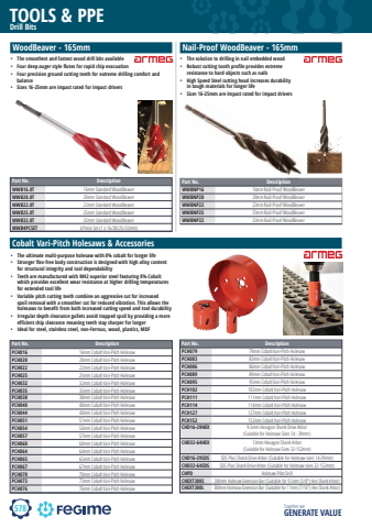 578TOOLS & PPETogether we GENERATE VALUEDrill BitsWoodBeaver - 165mm%u2022 The smoothest and fastest wood drill bits available%u2022 Four deep auger style flutes for rapid chip evacuation%u2022 Four precision ground cutting teeth for extreme drilling comfort and balance%u2022 Sizes 16-25mm are impact rated for impact driversNail-Proof WoodBeaver - 165mm%u2022 The solution to drilling in nail embedded wood%u2022 Robust cutting tooth profile provides extreme resistance to hard objects such as nails%u2022 High Speed Steel cutting head increases durability in tough materials for longer life%u2022 Sizes 16-25mm are impact rated for impact driversPart No. DescriptionWWB16.0T 16mm Standard WoodBeaverWWB20.0T 20mm Standard WoodBeaverWWB22.0T 22mm Standard WoodBeaverWWB25.0T 25mm Standard WoodBeaverWWB32.0T 32mm Standard WoodBeaverWWB4PCSET 4 Piece Set (1 x 16/20/25/32mm)Part No. DescriptionWWBNP16 16mm Nail-Proof WoodBeaverWWBNP20 20mm Nail-Proof WoodBeaverWWBNP22 22mm Nail-Proof WoodBeaverWWBNP25 25mm Nail-Proof WoodBeaverWWBNP32 32mm Nail-Proof WoodBeaverSizes 16-25mm are impact rated for impact driversDescriptionCobalt Vari-Pitch Holesaws & Accessories%u2022 The ultimate multi-purpose holesaw with 8% cobalt for longer life%u2022 Stronger flex-free body construction is designed with high alloy content for structural integrity and tool dependability%u2022 Teeth are manufactured with M42 superior steel featuring 8% Cobalt which provides excellent wear resistance at higher drilling temperatures for extended tool life%u2022 Variable pitch cutting teeth combine an aggressive cut for increased spoil removal with a smoother cut for reduced vibration. This allows the holesaws to benefit from both increased cutting speed and tool durability%u2022 Irregular depth clearance gullets avoid trapped spoil by providing a more efficient chip clearance meaning teeth stay sharper for longer%u2022 Ideal for steel, stainless steel, non-ferrous, wood, plastics, MDFPart No. DescriptionPCH016 16mm Cobalt Vari-Pitch HolesawPCH020 20mm Cobalt Vari-Pitch HolesawPCH022 22mm Cobalt Vari-Pitch HolesawPCH025 25mm Cobalt Vari-Pitch HolesawPCH032 32mm Cobalt Vari-Pitch HolesawPCH035 35mm Cobalt Vari-Pitch HolesawPCH038 38mm Cobalt Vari-Pitch HolesawPCH040 40mm Cobalt Vari-Pitch HolesawPCH044 44mm Cobalt Vari-Pitch HolesawPCH051 51mm Cobalt Vari-Pitch HolesawPCH054 54mm Cobalt Vari-Pitch HolesawPCH057 57mm Cobalt Vari-Pitch HolesawPCH060 60mm Cobalt Vari-Pitch HolesawPCH064 64mm Cobalt Vari-Pitch HolesawPCH065 65mm Cobalt Vari-Pitch HolesawPCH067 67mm Cobalt Vari-Pitch HolesawPCH070 70mm Cobalt Vari-Pitch HolesawPCH073 73mm Cobalt Vari-Pitch HolesawPCH076 76mm Cobalt Vari-Pitch HolesawPart No. DescriptionPCH079 79mm Cobalt Vari-Pitch HolesawPCH083 83mm Cobalt Vari-Pitch HolesawPCH086 86mm Cobalt Vari-Pitch HolesawPCH089 89mm Cobalt Vari-Pitch HolesawPCH095 95mm Cobalt Vari-Pitch HolesawPCH102 102mm Cobalt Vari-Pitch HolesawPCH111 111mm Cobalt Vari-Pitch HolesawPCH114 114mm Cobalt Vari-Pitch HolesawPCH127 127mm Cobalt Vari-Pitch HolesawPCH152 152mm Cobalt Vari-Pitch HolesawCHD16-29HEX 9.5mm Hexagon Shank Drive Arbor (Suitable for Holesaw Sizes 14 - 29mm)CHD32-64HEX 13mm Hexagon Shank Arbor (Suitable for Holesaw Sizes 32-152mm)CHD16-29SDS SDS Plus Shank Drive Arbor (Suitable for Holesaw sizes 14-29mm)CHD32-64SDS SDS Plus Shank Drive Arbor (Suitable for Holesaw sizes 32-152mm)CHPD Holesaw Pilot DrillCHEXT300S 300mm Holesaw Extension Bar (Suitable for 9.5mm (3/8\CHEXT300L 300mm Holesaw Extension Bar (Suitable for 11mm (7/16\