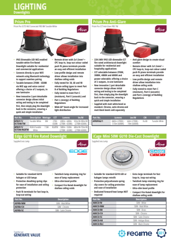 601LIGHTINGTogether we GENERATE VALUEcage miniedge GU10 frdPrism Pro %u2022 IP65 Dimmable LED WiZ enabled tunable white Fire Rated Downlight suitable for residential and commercial applications%u2022 Connects directly to your WiFi network using Bluetooth technology to support seamless pairing%u2022 Tunable between 2700K - 6500K via WiZ app and voice control offering a choice of 2 outputs, in one luminaire%u2022 New innovative 2 part detachable connector design allows initial wiring and testing to be completed first, then simply plug the downlight back to the connector, ensuring a quick and simple installation%u2022 Remote driver with 2x1.5mm%u00b2 + CPC loop-in, loop-out colour coded push fit piano terminals provide an easy and efficient installation%u2022 Low profile design and remote driver allows installation into shallow ceiling voids%u2022 Fully tested for 30, 60 and 90 minute ceiling types to meet Part B of Building Regulations%u2022 Fully tested to meet Part C (moisture), Part E (acoustic) and%u2022 Part L (energy) of Building Regulations%u2022 Wide 60%u00b0 beam angle for increased light distributionPrism Pro OCTO WiZ Connected FRD 8W Tunable WhiteEdge GU10 Fire Rated Downlight%u2022 Suitable for standard GU10 halogen or LED lamps%u2022 Protective sheathing spring clips for ease of installation and ceiling protection%u2022 Push fit terminals for fast loop-in, loop-out wiring%u2022 Twistlock lamp retaining ring for ease of lamp replacement%u2022 Ultra-slim bezel profile%u2022 Compact Fire Rated downlight for shallow ceiling voidsSupplied Less LampPart No. DescriptionAEFRD/MW 50W - Matt WhiteAEFRD/CH 50W - ChromeAEFRD/SC 50W - Satin ChromePrism Pro Anti-GlarePrism Pro CCT Anti-Glare FRD 7WiCage Mini 50W GU10 Die-Cast Downlight%u2022 Suitable for standard GU10 LED or halogen lamps retrofit%u2022 Protective polycarbonate spring clip covers for ceiling protection and ease of installation%u2022 Dedicated forward heat lamps NOT required%u2022 Extra large terminals for fast loop-in, loop-out wiring%u2022 Twistlock lamp retaining ring for ease of lamp replacement%u2022 Ultra-slim bezel profile%u2022 Compact Fire Rated downlight for shallow ceiling voidsSupplied Less LampPart No. DescriptionAMICD/W 50W - WhiteAMICD/MW 50W - Matt WhiteAMICD/BR 50W - BrassAMICD/CH 50W - ChromeAMICD/SC 50W - Satin ChromeAMICD/AB 50W - Antique BrassAMICD/BLC 50W - Black ChromeDownlightsPart No. Description Wattage CCT Lumens lm/WAPRIP/1/OCTOW/TWTunable White 8W 2700-6500K690lm - 680lm (2700K - 6500K)92lm/W-90lm/W (2700K-6500K)APRIP/1/OCTOW/RGBTWRGB & TunableWhite7.5W RGBTW 500lm - 550lm (2700K - 6500K)68lm/W-75lm/W (2700K-6500K)Part No. Lumens Lm/W CRI CCTAPRIPAG/1 460lm (2700K) - 515lm (6000K)66lm (2700K) - 74lm (6000K)Ra 80 Tunable White%u2022 220-240V IP65 LED dimmable CCT fire rated architectural downlight suitable for residential and hospitality applications%u2022 CCT selectable between 2700K, 3000K, 4000K and 6000K and power selectable; offering a choice of 2 outputs, in one luminaire%u2022 New innovative 2 part detachable connector design allows initial wiring and testing to be completed first, then simply plug the downlight back to the connector, ensuring a quick and simple installation%u2022 Supplied with matt white bezel as standard. Chrome, satin chrome and matt black bezels sold separately%u2022 Anti-glare design to create visual comfort%u2022 Remote driver with 2x1.5mm%u00b2 + CPC loop-in, loop-out colour coded push fit piano terminals provide an easy and efficient installation%u2022 Low profile design and remote driver allow installation into shallow ceiling voids%u2022 Fully tested to meet Part C (moisture), Part E (acoustic) and Part L (energy) of Building Regulations