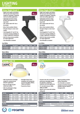 602LIGHTINGTogether we GENERATE VALUEPrimo Single Circuit 1%u2022 Single circuit modern and slimline LED track spot with integral driver suitable for hospitality, residential, retail and ancillary applications %u2022 Lightweight aluminium design provides sleek appearance and easy install %u2022 350%u00b0 rotation with 0-90%u00b0 tilt on the bracket %u2022 Mirror finish anodized reflector %u2022 Anti-glare design to create visual comfort %u2022 Interchangeable 24%u00b0 and 36%u00b0 lens accessories ensuring suitability for a range of application installations %u2022 Gold trim ring accessory available for unique appearance %u2022 Triac dimmable as standardPrimo Single Circuit 2Vantage UGR<19 FreskaLED SpotlightsCool WhiteWarm White%u2022 Single circuit modern and slimline LED track spot with integral driver suitable for hospitality, residential, retail and ancillary applications %u2022 Lightweight aluminium design provides sleek appearance and easy install %u2022 350%u00b0 rotation with 0-90%u00b0 tilt on the bracket %u2022 Mirror finish anodized reflector %u2022 Anti-glare design to create visual comfort %u2022 Interchangeable 24%u00b0 and 36%u00b0 lens accessories ensuring suitability for a range of application installations %u2022 Gold trim ring accessory available for unique appearance %u2022 Triac dimmable as standardPart No. Description Lumens Lm/W Cut-Out CCTAVANTLG1/CW 9W - Cool White 800lm 89lm/W 68mm 4000KAVANTLG2/CW 14W - Cool White 1500lm 107lm/W 100mm 4000KAVANTLG3/CW 28W - Cool White 2800lm 100lm/W 150mm 4000KAVANTLG4/CW 36W - Cool White 3900lm 108lm/W 200mm 4000KPart No. DescriptionAARXDLK/1 Downlight Anti-Ligature KitOptions Part No. DescriptionAHUEMKIT/LI Maintained/Non-maintained - Universal Emergency PackASBP/12 7.2V 3000mAh Ni-cd Replacement BatteryOptions%u2022 UGR<19 performance downlight suitable for commercial and education applications%u2022 Deep cut-off angle for glare control and comfort%u2022 UGR<19 (unified glare rating) compliant luminaire%u2022 Downlight design allows installation into existing hole cut-outs from 68mm,100mm, 150mm and 200mm%u2022 Powered by Tridonic%u2022 Economic ultra-slim circular LED performance downlight suitable for education, commercial, healthcare and retail applications%u2022 CCT selectable between 3000K, 4000K and 6000K%u2022 Ideal for use in areas with shallow ceiling void%u2022 Edge lit providing excellent uniform illumination%u2022 Triac dimmable as standard%u2022 Standard and Self-Test Emergency available using the Hawk Kit Emergency PackCool WhiteWarm WhitePart No. Description Colour Lumens Lm/W CCTAPRT1/P1/1/CW/W 10W - Cool White White 1000lm 100lm/W 4000KAPRT1/P1/1/CW/B 10W - Cool White Black 1000lm 100lm/W 4000KPart No. Description Colour Lumens Lm/W CCTAPRT1/P1/1/WW/W 10W - Warm White White 1000lm 100lm/W 3000KAPRT1/P1/1/WW/B 10W - Warm White Black 1000lm 100lm/W 3000KPart No. Description Colour Lumens Lm/W CCTAPRT2/P1/1/CW/W 20W - Cool White White 2100lm 105lm/W 4000KAPRT2/P1/1/CW/B 20W - Cool White Black 2100lm 105lm/W 4000KPart No. Description Colour Lumens Lm/W CCTAPRT1/P1/1/WW/W 20W - Warm White White 1900lm 93lm/W 3000KAPRT1/P1/1/WW/B 20W - Warm White Black 1900lm 93lm/W 3000KPart No. Description Lumens (4000K) Lm/W UGR CCTAFRE1/1 9W 137mm 840lm 105lm/W 25 Selectable3000/4000/6000K AFRE2/1 12W 180mm 1300lm 105lm/W 25AFRE3/1 18W 239mm 2000lm 105lm/W 25
