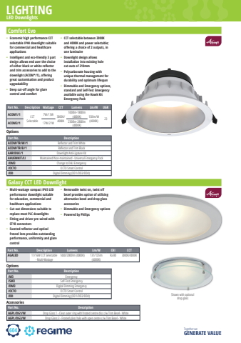 604LIGHTINGTogether we GENERATE VALUEComfort Evo%u2022 Economic high performance CCT selectable IP44 downlight suitable for commercial and healthcare applications%u2022 Intelligent and eco-friendly 3 part design allows end user the choice of either black or white reflector and trim accessories to add to the downlight (ACOM*/1), offering great customisation and product upgradability%u2022 Deep cut-off angle for glare control and comfort%u2022 CCT selectable between 3000K and 4000K and power selectable; offering a choice of 2 outputs, in one luminaire%u2022 Downlight design allows installation into existing hole cut-outs of 210mm%u2022 Polycarbonate housing with unique thermal management for durability and optimum lifespan%u2022 Dimmable and Emergency options, standard and Self-Test Emergency available using the Hawk Kit Emergency PackGalaxy CCT LED Downlight%u2022 Multi-wattage compact IP65 LED performance downlight suitable for education, commercial and healthcare applications%u2022 Cut-out dimensions suitable to replace most PLC downlights%u2022 Fitting and driver pre-wired with ST18 connectors%u2022 Faceted reflector and optical fresnel lens provides outstanding performance, uniformity and glare control%u2022 Removable twist on, twist off bezel provides option of utilising alternative bezel and drop glass accessories%u2022 Dimmable and Emergency options%u2022 Powered by PhilipsLED DownlightsPart No. DescriptionACOM/TR/W/1 Refl ector and Trim WhiteACOM/TR/B/1 Refl ector and Trim BlackAARXDLK/1 Downlight Anti-Ligature KitAHUEMKIT/LI Maintained/Non-maintained - Universal Emergency Pack/DM3 Change to DALI Emergency/OCTO OCTO Smart Control/DD Digital Dimming (DD1/DD3/DD4)OptionsPart No. Description/M3 Emergency/SM3 Self-Test Emergency/DM3 Digital Dimming Emergency/OCTO OCTO Smart Control/DD Digital Dimming (DD1/DD3/DD4)OptionsPart No. Description Lumens Lm/W CRI CCTAGALED 11/16W CCT Selectable - Multi-Wattage1440/2000lm (4000K) 131/125lm (4000K)Ra 80 3000K/4000KShown with optional drop glassPart No. DescriptionAGPL/DG1/W Drop Glass 1 - Clear outer ring with frosted centre disc c/w Trim Bezel - WhiteAGPL/DG3/W Drop Glass 3 - Frosted glass halo with open centre c/w Trim Bezel - WhiteAccessoriesPart No. Description Wattage CCT Lumens Lm/W UGRACOM1/1 CCT Selectable7W/13W 3000K/4000K1000lm-1800lm (4000K) 130lm/W(4000K) 23ACOM2/1 17W/21W 2300lm-2800lm (4000K)