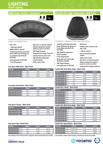 607LIGHTINGTogether we GENERATE VALUEasd lightingENSO Quart Exterior LuminairesPart No. Diff user Power LumensENQ/B4KLED0840-QM1 Clear 10.7W 1149lmENQ/B4KLED1250-QM1 Clear 19.7W 2101lmENQ/B4KLED2050-QM1 Clear 31.6W 3576lmExterior Lighting%u2022 IP65 / IK10.%u2022 > 100k hours L90-B10%u2022 4000K (3000K on request)%u2022 Standard specification paint finish passes 2,000 hours salt spray test in accordance with BS EN ISO 9227:2006%u2022 Latest generation of LED chips%u2022 5 Year LED guarantee%u2022 DALI Driver as standard (requires different wiring than standard product in order to use DALI)%u2022 10KV Surge Protection%u2022 Integrated Over Voltage Protection%u2022 Standby Power less than 0.5W%u2022 High operation temperature version available%u2022 ULOR as low as 0.6%Stealth Elite High Performance Wall PacksEnso Quart Wide Beam - Black FinishThe ENSO Quart is an exterior perimeter luminaire designed for modern architectural buildings in need of quality illuminance.Part No. Diff user Power LumensENQ/B4KLED0840-QF0 Clear 10.8W 1114lmENQ/B4KLED1250-QF0 Clear 20W 2042lmENQ/B4KLED2050-QF0 Clear 31.6W 3417lmEnso Quart Flood Beam - Black FinishPart No. Diff user Power LumensENQ/B4KLED0840-QM2 Clear 10.8W 1008lmENQ/B4KLED1250-QM2 Clear 19.8W 1838lmENQ/B4KLED2050-QM2 Clear 31.5W 3151lmEnso Quart T-Beam - Black FinishPart No. Diff user Power LumensENQ/BL4LED1600 Opal 15.6W 1631lmENQ/BL4LED2400 Opal 22.7W 2397lmENQ/BL4LED3100 Opal 29.9W 3124lmEnso Quart Opal - Black FinishAlso available in Grey & Titanium fi nishes. Emergency, PIR & Photocell options also available.Part No. Diff user Power LumensSEL/B4LED1500-S0 Clear 13.4W 1633.8lmSEL/B4LED2000-S0 Clear 16.7W 2076lmSEL/B4LED3000-S0 Clear 22.6W 3073.7lmSEL/B4LED3500-S0 Clear 27.4W 3717.3lmSEL/B4LED4000-S0 Clear 30.9W 4152.2lmSEL/B4LED5000-S0 Clear 44.2W 5687.8lm%u2022 Standard specification paint finish passes 2000 hours Salt Spray Test in accordance with BS EN ISO 9227:2006%u2022 High operation temperature version available%u2022 5 Year LED guarantee%u2022 Flood, wide and T beam angle distribution available%u2022 10KV Surge Protection%u2022 Latest generation of LED chips%u2022 Wall mount%u2022 Standby Power less than 0.5W%u2022 IP65 / IK10%u2022 > 100k hrs L90-B10%u2022 Die cast aluminium (powder coated)%u2022 ULOR as low as 0.6%%u2022 DALI Driver as standard (requires different wiring than standard product in order to use DALI)%u2022 Integrated Over Voltage ProtectionStealth Elite Flood Beam Angle - Black FinishThe Stealth Elite is a robust high performance exterior wallpack luminaire.Stealth Elite Wide Beam Angle - Black FinishPart No. Diff user Power LumensSEL/BL4LED2000 Premium Opal 21.1W 2081lmSEL/BL4LED3000 Premium Opal 29.6W 2903lmSEL/BL4LED4000 Premium Opal 41.3W 3883lmStealth Elite Opal Diff user - Black FinishPart No. Diff user Power LumensSEL/B4LED1500-T Clear 13.1W 1619.8lmSEL/B4LED2000-T Clear 16.8W 2071lmSEL/B4LED3000-T Clear 22.6W 3050.8lmSEL/B4LED3500-T Clear 27.3W 3694.6lmSEL/B4LED4000-T Clear 31.1W 4133.1lmSEL/B4LED5000-T Clear 44W 5634.7lmStealth Elite T-Beam - Black FinishAlso available in Titanium fi nish. Emergency, PIR & Photocell options also available.Part No. Diff user Power LumensSEL/B4LED1500-M1 Clear 13.1W 1609.7lmSEL/B4LED2000-M1 Clear 17W 2064.1lmSEL/B4LED3000-M1 Clear 22.8W 3006.5lmSEL/B4LED3500-M1 Clear 27.3W 3651.7lmSEL/B4LED4000-M1 Clear 31.2W 4093.8lmSEL/B4LED5000-M1 Clear 43.9W 5548.8lm