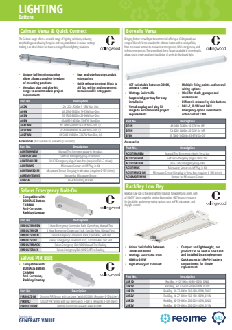 643LIGHTINGTogether we GENERATE VALUEBattensRackBay Low BayPart No. DescriptionLBR1D RackBay, 9-12-15Klm 60-80-100W, DALI2LBR1V RackBay , 9-12-15Klm 60-80-100W, 0-10VLBR2D RackBay, 24-27-30Klm 160-180-200W, DALI2LBR2V RackBay, 24-27-30Klm 160-180-200W, 0-10VLBR3D RackBay, 30-33-36Klm 200-220-240W, DALI2LBR3V RackBay, 30-33-36Klm 200-220-240W, 0-10V%u2022 Colour Switchable between 3000K and 4000K%u2022 Wattage Switchable from 60W to 240W%u2022 High efficacy of 150lm/W%u2022 Compact and lightweight, our product can be held in one hand and installed by a single person%u2022 Quick access to LiFePO4 battery compartment for simple replacementCaiman Versa & Quick Connect Borealis VersaThe Caiman range off ers a versatile range of lighting solutions, reducing stockholding and allowing for quick and easy installation in various settings, making it an ideal choice for those seeking effi cient lighting solutions.Part No. DescriptionAC2N 2ft 1250-2500lm 9-18W Non-DimAC4N 4ft 2590-5500lm 19-37W Non-DimAC5N 5ft 3920-8400lm 28-56W Non-DimAC6N 6ft 4690-10050lm 33-67W Non-DimAC4TWN 4ft 2800-5600lm 18-37W Non-Dim, QCAC5TWN 5ft 4200-8400lm 28-56W Non-Dim, QCAC6TWN 6ft 5000-10000lm 33-67W Non-Dim, QC%u2022 Unique full length mounting slider allows complete freedom of mounting positions %u2022 Versabox plug and play kit range to accommodate project requirements %u2022 Rear and side housing conduit entry points %u2022 Quick release terminal block to aid fast wiring and movement to mains cable entry point Part No. DescriptionEMBOLTMOPEN 3 Hour Emergency Conversion Pack, Open Area, Manual TestEMBOLTMCOR 3 Hour Emergency Conversion Pack, Corridor Area, Manual TestEMBOLTSOPEN 3 Hour Emergency Conversion Pack, Open Area, Self-TestEMBOLTSCOR 3 Hour Emergency Conversion Pack, Corridor Area Self TestEMBOLTMRACK Salvus Emergency Bolt M20 Manual Test RackingEMBOLTSRACK Salvus Emergency Bolt M20 Self Test RackingSalvus Emergency Bolt-OnSalvus PIR BoltPart No. DescriptionPIRBOLTDIM Dimming PIR Sensor with Lux Level Switch 0-2000lx (Requires 0-10V driver) PIRBOLT On/Off PIR Sensor with Lux level Switch 3-300 lx (Requires 0-10V driver) PIRBOLTDIMR Remote Control for use with PIRBOLTDIM%u2022 Compatible with: BOREALIS Batten, CAIMAN Anti-Corrosive, Rackbay Lowbay%u2022 Compatible with: BOREALIS Batten, CAIMAN Anti-Corrosive, Rackbay LowbayPart No. DescriptionACKITMANEM Manual Test Emergency plug-in VersaboxACKITSELFEM Self Test Emergency plug-in VersaboxACKITDALIEM DALI-2 Emergency plug-in Versabox (requires DALI-2 driver)ACKITMWS Microwave Sensor on/off Plug-in KitACKITMWSDIM MIcrowave Sensor Dim plug-in Versabox (requires 0-10V driver)ACREMOTEMWS Remote for Mircowave SensorACBESA BESA Mounting BracketAccessories (Not suitable for use with QC variants)Part No. DescriptionBT4N 4ft 2800-5600lm 18-37W On-Off BT5N 5ft 4200-8400lm 28-56W On-Off BT6N 6ft 5000-10000lm 33-67W On-Off Part No. DescriptionACKITMANEM Manual Test Emergency plug-in Versa boxACKITSELFEM Self Test Emergency plug-in Versa boxACKITDALIEM DALI-2 Add Emergency Plug-in KitACKITMWS Microwave Sensor on/off Plug-in KitACKITMWSDIM Microwave Sensor Dim plug-in Versa box (requires 0-10V driver)ACREMOTEMWS Remote for Microwave SensorAccessoriesBringing further versatility to the commercial off ering at Collingwood, our range of Borealis Versa provides the ultimate batten with a variety of kits, from microwave sensors to manual test emergencies, DALI emergencies, and self-test emergencies. The streamlined linear fi xture, available in three lengths, allows you to create a uniform installation of perfectly distributed light.%u2022 CCT switchable between 3000K, 4000K & 5700K %u2022 Wattage Switchable%u2022 Suspended gear tray for easy installation%u2022 Versabox plug and play kit range to accommodate project requirements%u2022 Multiple fixing points and several wiring options%u2022 Ideal for sheds, garages and warehouses%u2022 Diffuser is released by side buttons%u2022 DALI-2, 0-10V and DALI Emergency option available to order contact CWDRackbay Low Bay is the ideal lighting solution for warehouse aisles, with a 110x55%u00b0 beam angle for precise illumination, IK07 impact resistance for durability, and energy-saving options such as PIR, microwave, and daylight control.