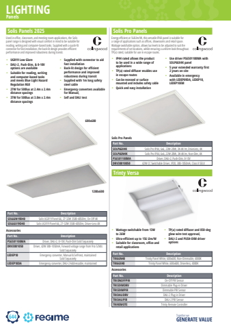 644LIGHTINGTogether we GENERATE VALUEPanelsSolis Panels 2025%u2022 UGR19 Low Glare%u2022 DALI-2, Push-Dim, & 0-10V options are available%u2022 Suitable for reading, writing and computer-based tasks and meets Blue Light Hazard Regulation RG0%u2022 27W for 500lux at 2.4m x 2.4m distance spacings%u2022 37W for 500lux at 3.0m x 2.4m distance spacings%u2022 Supplied with connector to aid fast installation%u2022 Back-lit design for efficient performance and improved robustness during transit%u2022 Supplied with 1m long safety steel cable%u2022 Emergency converters available for Manual,%u2022 Self and DALI testUsed in offi ce, classroom, and meeting room applications, the Solis panel range is designed with visual comfort in mind to be suitable for reading, writing and computer-based tasks. Supplied with a quick-fi t connector for fast installation, the back-lit design provides effi cient performance and improved robustness during transit.Solis Pro Panels%u2022 IP44 rated allows the product to be used in a wide range of applications%u2022 TP(a) rated diffuser enables use in escape routes%u2022 Can be recessed or surface mounted and includes safety cable%u2022 Quick and easy installation%u2022 Use driver PS6501100MA with SOLP66X4K panel%u2022 5 year extended warranty first 2 years on site %u2022 Available in emergency with LEDEP09DA, LEDEP10, LEDEP10EMEnergy effi cient at 164Llm/W, this versatile IP44 panel is suitable for a range of applications such as offi ces, showrooms and retail space.%u00a0 Wattage switchable option, allows lux levels to be adjusted to suit the requirements of set locations, whilst ensuring a uniform look throughout. TP(a) rated, suitable for use in escape routes.%u00a0 Solis Pro PanelsPart No. DescriptionSOLP66X4K Solis Pro IP44, 6x6, 22W-28W, 3K-4K lm, DriveLess, 4KSOLP66N4K Solis Pro IP44, 6x6, 22W-28W, 3K-4K lm, Non-Dim, 4KPS6501100MA Driver, DALI-2, Push-Dim, 0-10VDRV30010050 42W CC Switchable Driver, IP20, 300-1050mA, Class II SELV600x6001200x600Trinty Versa%u2022 Wattage switchable from 13W to 26W%u2022 Ultra-efficient up to 156 Llm/W%u2022 Suitable for classroom, office and retail applications%u2022 TP(a) rated diffuser and 850-deg glow wire test approval,%u2022 DALI-2 and PUSH-DIM driver optionsPart No. DescriptionTRI66N40 Trinity Panel White, 600x600, Non-Dimmable, 4000KTRI66X40 Trinity Panel White, 600x600, Driverless, 4000KPart No. DescriptionTRIONOFFPIR On-Off PIR SensorTRISDIMDRV Dimmable Plug-in DriverTRISDIMPIR Dimmable PIR SensorTRIDALIDRV DALI-2 Plug-in DriverTRIDALIPIR DALI-2 PIR SensorTRIREMOTE Trinity Remote ControllerAccessoriesPart No. DescriptionSOL66N19D40 Solis UGR19 Panel 66, 27-32W 3500-4050lm, On-Off 4KSOL66X19D40 Solis UGR19 Panel 66, 27-32W 3500-4050lm, Driver-Less 4KAccessoriesPart No. DescriptionPS6501100MA Driver, DALI-2, 0-10V, Push-Dim Sold SeparatelyDRV3001050 Driver, 42W 300-1050mA, Forward voltage range from 9 to 52Vdc Sold SeparatelyLEDEP10 Emergency converter, Manual & Self-test, maintained Sold SeparatelyLEDEP10DA Emergency converter, DALI-2 Addressable, maintained