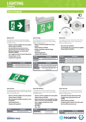 645LIGHTINGTogether we GENERATE VALUESalvus EmergencyPart No. DescriptionEMBW1MS White Bulkhead Manual and SelfTestEMBW3MS White Bulkhead Manual and SelfTest%u2022 Manual or Self-Test available in the same product%u2022 Lithium batteries (LiFePO4) %u2022 Has three M20 entry knock-outs (one on each side and one in the bottom), and rear BESA box fixing points, so can fit to most installation methods%u2022 Lens is rugged and made from robust Polycarbonate%u2022 Viewing distance of 18m%u2022 Complete with Legend KitThese bulkheads contain the very latest LED and battery technology to ensure a modern solution with long lifetimes and high performance.Bulkhead IP65%u2022 Manual or Self-Test available in the same product%u2022 Lithium batteries (LiFePO4) %u2022 Side entry knocks and BESA connection for ease of mounting%u2022 32M Viewing Distance %u2022 Complete with Legend KitThis emergency fi nal exit luminaire contain the very latest LED and battery technology to ensure a modern solution with long lifetimes and high performance.Saluvs Exit Box%u2022 Manual or Self-Test available in the same product%u2022 Lithium batteries (LiFePO4) %u2022 Multiple installation methods through accessories%u2022 24M Viewing Distance %u2022 Complete with Legend KitThese emergency blades contain the very latest LED and battery technology to ensure a modern solution with long lifetimes and high performance.Saluvs Exit SignAccessoriesThe emergency salvus route contains the very latest LED and battery technology to ensure a modern solution with long lifetimes and high performance.Salvus Route%u2022 Quick and easy installation%u2022 Interchangeable open area/corridor lens supplied%u2022 Lithium batteries (LiFePO4) Part No. DescriptionEMTW5MS Salvus Twin Spot, Manual and Self TestThis emergency twin spot contains the very latest LED and battery technology to ensure a modern solution with long lifetimes and high performance.Salvus Twin Spot%u2022 Adjustable LED heads allow beam aiming%u2022 A rugged robust polycarbonate lens and housing%u2022 Lithium batteries (LiFePO4) %u2022 Installation gland included in box with screws%u2022 Has three M20 entry knock-outs EmergencyPart No. DescriptionEMRW1MS Salvus Route White, Manual and Self TestEMRSW2MS Salvus Route White, Manual and Self TestEMRW3MS Salvus Route White, Manual and SelfTest%u2022 Manual or Self-Test available in the same product%u2022 Lithium batteries (LiFePO4) %u2022 M20 entry knock-outs and rear BESA box fixing points, so can fit to most installation methods%u2022 Lens is rugged and made from robust Polycarbonate%u2022 8W 1500lm %u2022 IP65 / IK10Salvus Max Bulkhead Part No. DescriptionEMBLWMS 24M, White, Manual and Self TestPart No. DescriptionEMBLWRK Salvus Exit Sign 24M, White Recessing KitEMBLWSK Salvus Exit Sign 24M, White Susp KitEMBLWSMB Salvus Exit Sign 24M, White Side Mount BracketPart No. DescriptionEMBXWMS White, Manual and Self TestThese bulkheads contain the very latest LED and battery technology to ensure a modern solution with long lifetimes and high performance.Part No. DescriptionEMBMAXWMS Salvus Max Bulkhead, Manual and Self Test