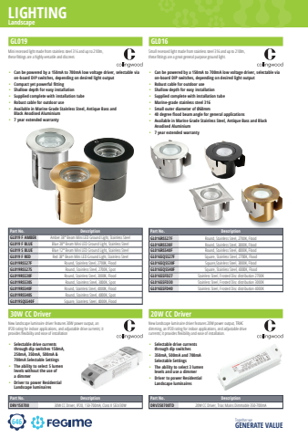 646LIGHTINGTogether we GENERATE VALUEGL019Part No. DescriptionGL019 F AMBER Amber 38%u00b0 Beam Mini LED Ground Light, Stainless SteelGL019 F BLUE Blue 38%u00b0 Beam Mini LED Ground Light, Stainless SteelGL019 S BLUE Blue 12%u00b0 Beam Mini LED Ground Light, Stainless SteelGL019 F RED Red 38%u00b0 Beam Mini LED Ground Light, Stainless SteelGL019RSS27F Round, Stainless Steel, 2700K, FloodGL019RSS27S Round, Stainless Steel, 2700K, SpotGL019RSS30F Round, Stainless Steel, 3000K, FloodGL019RSS30S Round, Stainless Steel, 3000K, SpotGL019RSS40F Round, Stainless Steel, 4000K, FloodGL019RSS40S Round, Stainless Steel, 4000K, SpotGL019SQSS40F Square, Stainless Steel, 4000K, Flood%u2022 Can be powered by a 150mA to 700mA low voltage driver, selectable via on-board DIP switches, depending on desired light output%u2022 Compact yet powerful fitting %u2022 Shallow depth for easy installation %u2022 Supplied complete with installation tube%u2022 Robust cable for outdoor use %u2022 Available in Marine Grade Stainless Steel, Antique Bass and Black Anodised Aluminium %u2022 7 year extended warranty Mini recessed light made from stainless steel 316 and up to 210lm, these fi ttings are a highly versatile and discreet.LandscapePart No. DescriptionGL016RSS27F Round, Stainless Steel, 2700K, FloodGL016RSS30F Round, Stainless Steel, 3000K, FloodGL016RSS40F Round, Stainless Steel, 4000K, FloodGL016SQSS27F Square, Stainless Steel, 2700K, FloodGL016SQSS30F Square,Stainless Steel, 3000K, FloodGL016SQSS40F Square, Stainless Steel, 4000K, FloodGL016SSFD27 Stainless Steel, Frosted Disc distribution 2700KGL016SSFD30 Stainless Steel, Frosted Disc distribution 3000KGL016SSFD40 Stainless Steel, Frosted Disc distribution 4000K%u2022 Can be powered by a 150mA to 700mA low voltage driver, selectable via on-board DIP switches, depending on desired light output%u2022 Robust cable for outdoor use %u2022 Shallow depth for easy installation %u2022 Supplied complete with installation tube%u2022 Marine-grade stainless steel 316 %u2022 Small outer diameter of %u00d860mm %u2022 40 degree flood beam angle for general applications %u2022 Available in Marine Grade Stainless Steel, Antique Bass and Black Anodised Aluminium %u2022 7 year extended warranty Small recessed light made from stainless steel 316 and up to 210lm, these fi ttings are a great general purpose ground light.GL01630W CC DriverNew landscape luminaire driver features 30W power output, an IP20 rating for indoor applications, and adjustable drive currents; it provides fl exibility and ease of installationPart No. DescriptionDRV150700 30W CC Driver, IP20, 150-700mA, Class II SELV30W%u2022 Selectable drive currents through dip switches 150mA, 250mA, 350mA, 500mA & 700mA Selectable Settings%u2022 The ability to select 5 lumen levels without the use of a dimmer%u2022 Driver to power Residential Landscape luminaires20W CC DriverNew landscape luminaire driver features 20W power output, TRIAC dimming, an IP20 rating for indoor applications, and adjustable drive currents; it provides fl exibility and ease of installation. Part No. DescriptionDRV350700TD 20W CC Driver, Triac Mains Dimmable 350-700mA%u2022 Selectable drive currents through dip switches%u2022 350mA, 500mA and 700mA Selectable Settings%u2022 The ability to select 3 lumen levels and use a dimmer%u2022 Driver to power Residential Landscape luminaires
