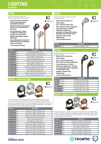 647LIGHTINGTogether we GENERATE VALUESL220Part No. DescriptionSL220BK30XF Black, 3000K, Low Voltage, FloodSL220SS30XF Stainless Steel, 3000K, Low Voltage, FloodSL220BZ30XF Bronze, 3000K, Low Voltage, FloodSL220BK27XF Black, 2700K, Low Voltage, FloodSL220SS27XF Stainless Steel, 2700K, Low Voltage, FloodSL220BZ27XF Bronze, 2700K, Low Voltage, FloodSL220BK30MF Black, 3000K, Mains Voltage, FloodSL220SS30MF Stainless Steel, 3000K, Mains Voltage, FloodSL220BZ30MF Bronze, 3000K, Mains Voltage, FloodSL220BK27MF Black, 2700K, Mains Voltage, FloodSL220SS27MF Stainless Steel, 2700K, Mains Voltage, FloodSL220BZ27MF Bronze, 2700K, Mains Voltage, Flood%u2022 Single LED and lens combination for maximum efficiency and optimal light distribution%u2022 Available in Marine Grade Stainless Steel, Bronze or Black Anodised Aluminium%u2022 Can be powered by a 150mA to 700mA low voltage driver, selectable via on-board DIP switches, depending on desired light output%u2022 Can be fully tilted and rotated for flexible illumination of planting as it grows and changes%u2022 7 year extended warrantyUp to 163lm/W these spike lights have ultimate versatility with a tiltable head of 90%u00b0.LandscapeSL030Part No. DescriptionSL030 F 27 Stainless Steel Spikelight, 2700K %u2022 Robust cable for outdoor use%u2022 Small & stylish%u2022 Up to 140 lumens light output%u2022 IP65 is perfect for exterior applications%u2022 Can be powered by a 150mA to 700mA low voltage driver, selectable via on-board DIP switches, depending on desired light output%u2022 Available in Marine Grade Stainless Steel%u2022 7 year extended warrantyA small 1W spike light for effi cient and eff ective portable illumination.Part No. DescriptionSL13040 SL130 Spike Light, Black, 4000KSL13030 SL130 Spike Light, Black, 3000KSL13027 SL130 Spike Light, Black, 2700KSL130ZMBX27 SL130 Spike Light, Bronze, 2700KSL130ZMBX30 SL130 Spike Light, Bronze, 3000KSL130ZMBX40 SL130 Spike Light, Bronze, 4000KSL130%u2022 Robust cable for outdoor use%u2022 Small & stylish%u2022 Up to 140 lumens light output%u2022 IP65 is perfect for exterior applications%u2022 Can be powered by a 150mA to 700mA low voltage driver, selectable via on-board DIP switches, depending on desired light output%u2022 Available in Marine Grade Stainless Steel%u2022 7 year extended warrantyUL030 - Universal Light This versatile, swivel-mounted universal light off ers endless possibilities and ensures that any corner of a landscape can be lit, whether that%u2019s a pond, tree or anything in-between. With an antique brass, marine grade stainless steel or black anodised aluminium bracket, 12%u00b0 or 40%u00b0 beam angle, IP68 water-resistance rating and bright 4.6W LED light output equivalent to a 35W halogen, it throws light into even the darkest and wettest environments.Part No. DescriptionUL030AB27XS Antique Brass, 2700K, Low Voltage, SpotUL030AB30XS Antique Brass, 3000K, Low Voltage, SpotUL030AB27XF Antique Brass, 2700K, Low Voltage, FloodUL030AB30XF Antique Brass, 3000K, Low Voltage, FloodUL030BK27XF Black, 2700K, Low Voltage, FloodUL030BK30XF Black, 3000K, Low Voltage, FloodUL030SS27XS Stainless Steel, 2700K, Low Voltage, SpotUL030SS30XS Stainless Steel, 3000K, Low Voltage, SpotUL030SS40XS Stainless Steel, 4000K, Low Voltage, SpotUL030SS27XF Stainless Steel, 2700K, Low Voltage, FloodUL030SS30XF Stainless Steel, 3000K, Low Voltage, FloodUL030SS40XF Stainless Steel, 4000K, Low Voltage, FloodUL010 - Universal LightIlluminate your garden or pond from any angle as this swivel-mounted universal light throws a beam in any direction. Made from marine grade stainless steel 316, brass or black anodised aluminium, 40%u00b0 beam angle, IP68 water-resistance rating and 2.2W LED light output, it gives you plenty of light to experiment with.Part No. DescriptionUL010AB27XF Antique Brass, 2700K, Low Voltage, FloodUL010AB30XF Antique Brass, 3000K, Low Voltage, FloodUL010BK27XF Black, 2700K, Low Voltage, FloodUL010BK30XF Black, 3000K, Low Voltage, FloodUL010SS27XF Stainless Steel, 2700K, Low Voltage, FloodUL010SS40XF Stainless Steel, 4000K, Low Voltage, FloodUL010SS40XF Stainless Steel, 4000K, Low Voltage, FloodA small 1W spike light for effi cient and eff ective portable illumination.
