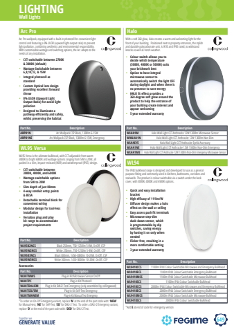 649LIGHTINGTogether we GENERATE VALUEWall LightsArc Pro%u2022 CCT switchable between 2700K & 3000K (default) %u2022 Wattage Switchable between 6,8,10,12, & 15W%u2022 Integral photocell as standard %u2022 Custom Optical lens design providing excellent forward throw%u2022 0% ULOR (Upward Light Output Ratio) for avoid light pollution %u2022 Designed to illuminate a pathway efficiently and safely, whilst preserving the habitatArc Pro wallpack, equipped with a built-in photocell for convenient light control and featuring a 0% ULOR (upward light output ratio) to prevent light pollution, combining aesthetics and environmental responsibility. With customisable wattage and switching options, the Arc adapts to the needs of any installation.Part No. DescriptionARPB1N Arc Wallpack CSP Black, 1300lm 6-15WARPB1NE Arc Wallpack CSP Black, 1300lm 6-15W, EmergencyHaloWith a soft 360 glow, Halo creates a warm and welcoming light for the front of your building. %u00a0Positioned next to property entrances, the stylish and durable polycarbonate unit, is IK10 and IP65 rated, to withstand knocks as well as harsh weather.Part No. DescriptionWLHA1M Halo Wall Light CCT Anthracite 12W 1300lm Microwave SensorWWLHA1N Halo Wall Light CCT Anthracite 12W 1300lm Non-DimWLHAEYE Halo Wall Light CCT Anthracite Eyelid AccessoryWLHA1NE Halo Wall Light CCT Anthracite 12W 1300lm Non-Dim EmergencyWLHA1ME Halo Wall Light CCT Anthracite 12W 1300lm Non-Dim Emergency Microwave SensorWL95 Versa%u2022 CCT switchable between 3000K, 4000K, and 6000K%u2022 Wattage switchable options from 5W to 20W%u2022 Slim depth of just 80mm%u2022 4-way conduit entry points & BESA%u2022 Detachable terminal block for convenient wiring%u2022 Modular design for tool-less installation%u2022 Versabox plug and play kit range to accommodate project requirementsWL95 Versa is the ultimate bulkhead, with CCT adjustable from warm 3000K to bright 6000K and wattage options ranging from 5W to 20W, all packed in a slim, impact-resistant (IK09) and weatherproof (IP65) design. Part No. DescriptionWL95B2NCS Black 250mm, 750-1250lm 5-8W, OnOff , CSPWL95W2NCS White 250mm, 750-1250lm 5-8W, OnOff , CSPWL95B3NCS Black 300mm, 1450-3000lm 10-20W, OnOff , CSPWL95W3NCS White 300mm, 1450-3000lm 10-20W, OnOff , CSPWL94%u2022 Quick and easy installation bracket%u2022 High efficacy of 111lm/W%u2022 Diffuser design makes a halo effect on the wall or ceiling%u2022 Easy access push fit terminals%u2022 Microwave step-dim dusk-dawn sensor, which is programmable by dip switches, saving energy by having it on only when needed%u2022 Flicker free, resulting in a more comfortable setting%u2022 3 year extended warrantyThe IP44 bulkhead range is designed and developed for use as a general purpose fi tting and commonly used in kitchens, bathrooms, corridors and stairwells. The product is colour switchable via a switch under the back cover, with 3000K, 4000K and 6500K options. Part No. DescriptionWL9410CCS 1100lm IP44 Colour Switchable Microwave and Emergency BulkheadWL9410ECS 1100lm IP44 Colour Switchable Emergency BulkheadWL9410MCS 1100lm IP44 Colour Switchable Microwave BulkheadWL9410SCS 1100lm IP44 Colour Switchable BulkheadWL9418CCS 2000lm IP44 Colour Switchable Microwave and Emergency BulkheadWL9418ECS 2000lm IP44 Colour Switchable Emergency BulkheadWL9418MCS 2000lm IP44 Colour Switchable Microwave BulkheadWL9418SCS 2000lm IP44 Colour Switchable Bulkhead%u2022 Colour switch allows you to decide which temperature (3000K, 4000K or 5000K) suits your brickwork best%u2022 Option to have integral microwave sensor to automatically switch the light OFF during daylight and when there is no presence to save energy%u2022 HALO lit effect provides a 360-degree soft glow around the product to help the entrance of your building create interest and appear welcoming%u2022 5 year extended warranty*Add E at end of code for emergency versionPart No. DescriptionWLKITMWS Plug-in Kit Microwave Sensor OnOff WLKITPC Plug-in Kit PhotocellWLKITDALIEM Plug-in Kit DALI2-Test Emergency (only assembled by collingwood)WLKITSELFEM Plug-in Kit Self-Test EmergencyWLKITMANEM Plug-in Kit Manual Test EmergencyAccessories*To order an On-Off Emergency variant, replace %u2018N%u2019 at the end of the part code with: %u2018NEM%u2019 for Manual-test, %u2018NE%u2019 for Self-Test, %u2018ED%u2019 for DALI-2 Test. To order a DALI-2 Emergency variant, replace %u2018D%u2019 at the end of the part code with: %u2018DED%u2019 for DALI-2 Test.