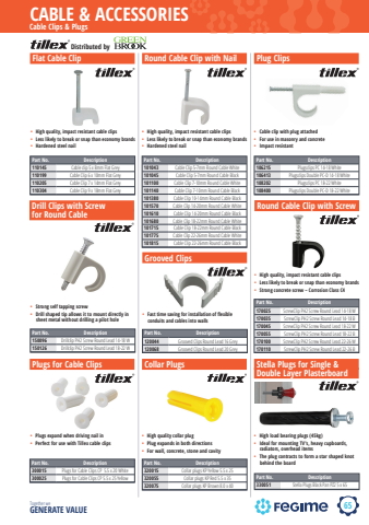 65CABLE & ACCESSORIESTogether we GENERATE VALUETillexCable Clips & Plugs%u2022 Strong self tapping screw%u2022 Drill shaped tip allows it to mount directly in sheet metal without drilling a pilot holePart No. Description150096 Drillclip PH2 Screw Round Lead 14-18 W150126 Drillclip PH2 Screw Round Lead 18-22 WDrill Clips with Screw for Round Cable%u2022 High quality, impact resistant cable clips%u2022 Less likely to break or snap than economy brands%u2022 Hardened steel nailPart No. Description101043 Cable Clip 5-7mm Round Cable White101045 Cable Clip 5-7mm Round Cable Black101100 Cable Clip 7-10mm Round Cable White101140 Cable Clip 7-10mm Round Cable Black101380 Cable Clip 10-14mm Round Cable Black101570 Cable Clip 14-20mm Round Cable White101610 Cable Clip 14-20mm Round Cable Black101680 Cable Clip 18-22mm Round Cable White101715 Cable Clip 18-22mm Round Cable Black101775 Cable Clip 22-26mm Round Cable White101815 Cable Clip 22-26mm Round Cable BlackRound Cable Clip with Nail%u2022 Cable clip with plug attached%u2022 For use in masonry and concrete%u2022 Impact resistantPart No. Description106215 Plugsclips PC 14-18 White106413 Plugsclips Double PC-D 14-18 White108202 Plugsclips PC 18-22 White108400 Plugsclips Double PC-D 18-22 WhitePlug Clips%u2022 High quality, impact resistant cable clips%u2022 Less likely to break or snap than economy brands%u2022 Hardened steel nailPart No. Description110145 Cable clip 5 x 8mm Flat Grey110199 Cable Clip 6 x 10mm Flat Grey110205 Cable Clip 7 x 14mm Flat Grey110304 Cable Clip 9 x 18mm Flat GreyFlat Cable Clip%u2022 Fast time saving for installation of flexible conduits and cables into wallsGrooved ClipsPart No. Description120044 Grooved Clips Round Lead 16 Grey120068 Grooved Clips Round Lead 20 Grey%u2022 High quality, impact resistant cable clips%u2022 Less likely to break or snap than economy brands%u2022 Strong concrete screw %u2013 Corrosion Class C4Part No. Description170025 ScrewClip PH2 Screw Round Lead 14-18 W170035 ScrewClip PH2 Screw Round Lead 14-18 B170045 ScrewClip PH2 Screw Round Lead 18-22 W170055 ScrewClip PH2 Screw Round Lead 18-22 B170100 ScrewClip PH2 Screw Round Lead 22-26 W170110 ScrewClip PH2 Screw Round Lead 22-26 BRound Cable Clip with Screw%u2022 Plugs expand when driving nail in%u2022 Perfect for use with Tillex cable clipsPlugs for Cable ClipsPart No. Description300015 Plugs for Cable Clips CP 5.5 x 20 White300025 Plugs for Cable Clips CP 5.5 x 25 Yellow%u2022 High quality collar plug%u2022 Plug expands in both directions%u2022 For wall, concrete, stone and cavityCollar PlugsPart No. Description320015 Collar plugs KP Yellow 5.5 x 25320055 Collar plugs KP Red 5.5 x 35320075 Collar plugs KP Brown 8.0 x 40Tillex%u2022 High load bearing plugs (45kg)%u2022 Ideal for mounting TV's, heavy cupboards, radiators, overhead items%u2022 The plug contracts to form a star shaped knot behind the boardPart No. Description330051 Stella Plugs Black Pan PZ2 5 x 65Stella Plugs for Single & Double Layer PlasterboardDistributed by