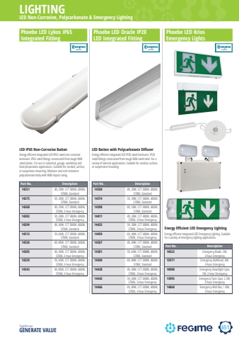 651LIGHTINGTogether we GENERATE VALUEPhoebe LED Lykos IP65 Integrated FittingPhoebe LED Oracle IP20 LED Integrated FittingPhoebe LED Krios Emergency Lights Part No. Description14350 4ft, 20W, CCT 3000K, 4000K, 5700K, Standard14374 5ft, 30W, CCT 3000K, 4000K, 5700K, Standard14398 6ft, 50W, CCT 3000K, 4000K, 5700K, Standard14411 4ft, 20W, CCT 3000K, 4000K, 5700K, 3-hour Emergency14435 5ft, 30W, CCT 3000K, 4000K, 5700K, 3-hour Emergency14459 6ft, 40W, CCT 3000K, 4000K, 5700K, 3-hour Emergency14367 4ft, 40W, CCT 3000K, 4000K, 5700K, Standard14381 5ft, 60W, CCT 3000K, 4000K, 5700K, Standard14404 6ft, 80W, CCT 3000K, 4000K, 5700K, Standard14428 4ft, 40W, CCT 3000K, 4000K, 5700K, 3-hour Emergency14442 5ft, 60W, CCT 3000K, 4000K, 5700K, 3-hour Emergency14466 6ft, 80W, CCT 3000K, 4000K, 5700K, 3-hour EmergencyPart No. Description14251 4ft, 20W, CCT 3000K, 4000K, 5700K, Standard14275 5ft, 30W, CCT 3000K, 4000K, 5700K, Standard14268 4ft, 20W, CCT 3000K, 4000K, 5700K, 3-hour Emergency14282 5ft, 30W, CCT 3000K, 4000K, 5700K, 3-hour Emergency14299 4ft, 40W, CCT 3000K, 4000K, 5700K, Standard14312 5ft, 60W, CCT 3000K, 4000K, 5700K, Standard14336 6ft, 80W, CCT 3000K, 4000K, 5700K, Standard14305 4ft, 40W, CCT 3000K, 4000K, 5700K, 3-hour Emergency14329 5ft, 60W, CCT 3000K, 4000K, 5700K, 3-hour Emergency14343 6ft, 80W, CCT 3000K, 4000K, 5700K, 3-hour EmergencyPart No. Description14022 Emergency Blade, 2W, 3-hour Emergency13971 Emergency Bulkhead, 4W, 3-hour Emergency14008 Emergency Downlight Spot, 1W, 3-hour Emergency13995 Emergency Twin Spot, 2.3W, 3-hour Emergency14060 Emergency Wall Box, 1.8W, 3-hour EmergencyLED Non-Corrosive, Polycarbonate & Emergency LightingEnergy Effi cient LED Emergency LightingEnergy effi cient integrated LED Emergency Lighting. Suitable for a variety of emergency lighting applications.Energy effi cient integrated LED IP20 rated luminaire. IP20 rated fi ttings constructed from tough IK04 rated steel. For a variety of internal applications. Suitable for conduit, surface, or suspension mounting. LED IP65 Non-Corrosive Batten LED Batten with Polycarbonate Diff userEnergy effi cient integrated LED IP65 rated non-corrosive luminaire. IP65 rated fi ttings constructed from tough IK08 rated plastic. For use in industrial, garage, workshop and food preparation applications. Suitable for conduit, surface, or suspension mounting. Moisture and acid resistance polycarbonate body with IK08 impact rating.crompton lamps crompton lamps crompton lamps