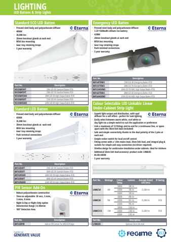 653LIGHTINGTogether we GENERATE VALUEeterna lightingLED Battens & Strip LightsStandard ECO LED BattenStandard LED BattenPIR Sensor Add-OnEmergency LED BattenColour Selectable LED Linkable Linear Under-Cabinet Strip Light%u2022 Pressed steel body and polycarbonate diffuser%u2022 4000K%u2022 30,000 hrs%u2022 20mm knockout glands at each end%u2022 BESA box mounting%u2022 Gear tray retaining straps%u2022 5 year warranty%u2022 Pressed steel body and polycarbonate diffuser%u2022 3.2V 1500mAh Lithium Ion battery%u2022 4200K%u2022 20mm knockout glands at each end%u2022 BESA box mounting%u2022 Gear tray retaining straps%u2022 Push terminal connections%u2022 5 year warranty%u2022 Pressed steel body and polycarbonate diffuser%u2022 4200K %u2022 35,000 hrs%u2022 20mm knockout glands at each end%u2022 BESA box mounting %u2022 Gear tray retaining straps%u2022 Push terminal connections%u2022 5 year warranty%u2022 Superb light output and distribution, with opal diffuser for a soft effect - perfect for task lighting%u2022 Easily select between warm white, cool white or day light via a simple switch to suit the application or preference%u2022 Link a maximum of 12 fittings end-to-end for a continuous line, or space apart with the 30cm link lead (included)%u2022 Safe and simple connectivity thanks to the dual polarity of the 2 pins at each end%u2022 Simple rocker switch for local on/off control%u2022 Fitting comes with a 1.8m mains lead, 30cm link lead, and integral plug & sockets for simple and easy connection (no driver required)%u2022 Slimline design for unobtrusive installation under cabinets. Ideal for kitchens%u2022 Additional 50cm link lead accessory: product code: LINKL05%u2022 BS EN 60598%u2022 5 year warranty%u2022 Robust polycarbonate construction%u2022 Time-on adjustable: 30 secs, 3 mins, 5 mins, 8 mins%u2022 Night & Day or Night Only option%u2022 Detectection Range 3-6 Metres%u2022 100%u00b0 Detection AreaPart No. DescriptionVECOBAT4FT 18W LED 4ft Standard Batten IP20VECOBAT5FT 24W LED 5ft Standard Batten IP20VECOBAT5HO 48W LED 5ft High Output Batten IP20VECOBAT6FT 32W LED 6ft Standard Batten IP20VECOBAT6HO 64W LED 6ft High Output Batten IP20Part No. DescriptionBATL4FTEM3 23W LED 4ft Emergency Batten IP20BATL5FTEM3 38W LED 5ft Emergency Batten IP20BATL5HOEM3 60W LED 5ft EMG.High Output Batten IP20BATL6FTEM3 48W LED 6ft Emergency Batten IP20BATL6HOEM3 65W LED 6ft EMG.High Output Batten IP20Part No. Wattage Colour Temp.Lumens Average Rated Life (Hrs)IP RatingLINKCS4 4W3000K 380 lm4200K 385 lm 25,000 hrs IP206500K 390 lmLINKCS9 9W3000K 896 lm4200K 901 lm 25,000 hrs IP206500K 905 lmLINKCS13 13W3000K 1264 lm4200K 1280 lm 25,000 hrs IP206500K 1295 lmPart No. DescriptionBATLEDPIR Add-on PIR Sensor For BATLED RangePart No. DescriptionBATLED4FT 23W LED 4ft Standard Batten IP20BATLED5FT 38W LED 5ft Standard Batten IP20BATLED5HO 60W LED 5ft High Output Batten IP20BATLED6FT 48W LED 6ft Standard Batten IP20BATLED6HO 65W LED 6ft High Output Batten IP20Part No. DescriptionLINKL05 Optional 50cm link lead