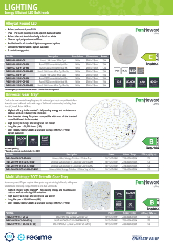 658LIGHTINGTogether we GENERATE VALUEAlleycat Round LEDPart No. Description Base Colour Dimensions PowerFHBL9965-160-W-OP Round 1300 Lumen White Opal White %u00d8300 x 118mm 13WFHBL9965-160-W-OP-EM Round 1300 Lumen White Opal Em White %u00d8300 x 118mm 13WFHBL9965-160-W-OP-MS Round 1300 Lumen White Opal Ms White %u00d8300 x 118mm 13WFHBL9965-160-W-OP-EM-MS Round 1300 Lumen White Opal Em Ms White %u00d8300 x 118mm 13WFHBL9965-210-W-OP Round 1900 Lumen White Opal White %u00d8300 x 118mm 19WFHBL9965-210-W-OP-EM Round 1900 Lumen White Opal Em White %u00d8300 x 118mm 19WFHBL9965-210-W-OP-MS Round 1900 Lumen White Opal Ms White %u00d8300 x 118mm 19WFHBL9965-210-W-OP-EM-MS Round 1900 Lumen White Opal Em Ms White %u00d8300 x 118mm 19W%u2022 Robust and vandal proof LED%u2022 IP65 %u2013 PU foam gasket protects against dust and water%u2022 Robust die-cast aluminium body in black or white%u2022 Clear or opal polycarbonate diffuser%u2022 Available with all standard light management options%u2022 CCT(3000K/4000K/6000K) option available%u2022 3 conduit entry pointsEnergy Efficient LED BulkheadsEM=Emergency / MS=Microwave Sensor. Corridor function optionalUniversal Gear Tray#Credit to the new invented 4-way fi t system, this universal gear tray is compatible with Fern Howard%u2019s round bulkheads and a wide range of bulkheads on the market, including those from JCC, Ansell, Robus & KSR etc.%u2022 Highest efficacy in the market* - help saving energy and maintenance costs as well as reducing CO2 emissions%u2022 New invented 4-way fit system - compatible with most of the branded round bulkheads in the market%u2022 High quality LED chips and integrated LED Driver%u2022 Long life span - 50,000 hours (L80)%u2022 3CCT (3000K/4000K/6000K) & Multiple wattage (14/15/17/19W) option availablePart No. Description Power Colour Temp. Effi cacy (Up to)FHBL-260-VW-CCT-GT-RND Universal Multi Wattage Tri Colour LED Gear Tray 14/15/17/19W 2700/4000/6500K 170FHBL-260-VW-CCT-EM-GT-RND Universal Multi Wattage Tri Colour LED Gear Tray EM 14/15/17/19W 2700/4000/6500K 170FHBL-260-VW-CCT-MS-GT-RND Universal Multi Wattage Tri Colour LED Gear Tray MS 14/15/17/19W 2700/4000/6500K 170FHBL-260-VW-CCT-MS-EM-GT-RND Universal Multi Wattage Tri Colour LED Gear Tray MS EM 14/15/17/19W 2700/4000/6500K 170# Patent pending* Based on internal market study, Dec 2022Multi-Wattage 3CCT Retrofit Gear TrayA one-component LED gear tray that allows you to upgrade existing bulkheads, adding new functions and improving energy-effi ciency in less than 60 seconds.%u2022 Highest efficacy in the market* - help saving energy and maintenance costs as well as reducing CO2 emissions%u2022 High quality LED chips and integrated LED Driver%u2022 Long life span - 50,000 hours (L80)%u2022 3CCT (3000K/4000K/6000K) & Multiple wattage (14/15/17/19W) Part No. Description Power Colour Temp. Effi cacy (Up to)FHBL260-VW-CCT-GT-SQ MULTI WATTAGE CCT LED GEARTRAY SQ 14/15/17/19W 2700/4000/6500K 170FHBL260-VW-CCT-EM-GT-SQ MULTI WATTAGE CCT LED GEARTRAY EM SQ 14/15/17/19W 2700/4000/6500K 170FHBL260-VW-CCT-MS-EM-GT-SQ MULTI WATTAGE CCT LED GEARTRAY MS EM SQ 14/15/17/19W 2700/4000/6500K 170Effi cacy (Up to)