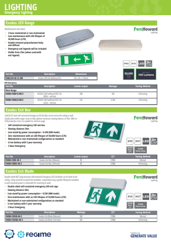660LIGHTINGTogether we GENERATE VALUEExodus LED RangePart No. Description DimensionsFHBL559-W-CL-EM Exodus 5W LED Bulkhead Em 355 x 82 x 124mmWeatherproof and robust%u2022 3 hour maintained or non-maintained%u2022 Low maintenance with LED lifespan of 50,000 hours (L70)%u2022 Vandal resistant polycarbonate body and diffuser%u2022 Emergency exit legends will be included%u2022 Visible from 25m (when used with exit legend)Emergency Lighting EM=Emergency Part No. Description Lumen output Wattage Testing MethodNew RangeFHEM-FXB01S/M/3 EXODUS EM bulkhead IP65 3hr 200lm - self-test200 3W Self-testingFHEM-FXB02S/M/3 EXODUS EM bulkhead IP65 3hr 325lm - self-test325 4.5W Self-testingExodus Exit BoxSolid IK 07 steel self-contained Emergency LED Exit Box can be xed to the ceiling or wall. Ideally place within larger areas to fully optimse maximum viewing distance of 34m. With an IP20 protection class it is suitable for internal usage.%u2022 Self-contained emergency LED exit box%u2022 Viewing distance 34m%u2022 Low stand-by power consumption < 0.5W (NM mode)%u2022 Zero maintenance with an LED lifespan of 50,000 hours (L70)%u2022 Maintained or non-maintained configurations as standard%u2022 Li-ion battery with 5 year warranty%u2022 3 Hour EmergencyPart No. Description Lumen output CCT Testing MethodFHEM-FXBX-M-3 Exodus Exit Box (Manual) 90 5700K ManualFHEM-FXBXS-M-3 Exodus Exit Box (Self-test) 90 5700K Self-testingExodus Exit BladeDouble-sided IK07 polycarbonate selfcontained Emergency LED Exit Blade can be fi xed to the ceiling, celing recessed mounted (kit available), suspended using a gimble fi tting (kit available) or wall mounted (panel is removable for mounting to wall).%u2022 Double sided self-contained emergency LED exit sign%u2022 Viewing distance 30m%u2022 Low stand-by power consumption < 0.5W (NM mode)%u2022 Zero maintenance with an LED lifespan of 50,000 hours (L70)%u2022 Maintained or non-maintained configurations as standard%u2022 Li-ion battery with 5 year warranty%u2022 3 Hour EmergencyPart No. Description Wattage CCT Testing MethodFHEM-FXEXB-M-3 Exodus Exit Blade (Manual) 5W 5700K ManualFHEM-FXEXBS-M-3 Exodus Exit Blade (Self-test) 5W 5700K Self-testingTesting Method