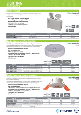 661LIGHTINGTogether we GENERATE VALUEEmergency Lighting Exodus TwinspotRobust IK10 polycarbonate Emergency LED Twinspot can be fi xed to the wall or ceiling. With an IP65 protection class it is suitable for internal and external usage. Manual and self-test versions available.%u2022 IP65, IK10 self-contained emergency twinspot%u2022 Low stand-by power consumption < 0.5W%u2022 Non-maintained 440lm in emergency mode%u2022 Li-ion battery with 5 year warranty%u2022 Suitable for indoor or outdoor applications%u2022 3 Hour EmergencyPart No. Description Wattage CCT Testing methodFHEM-FXTSO2-NM-3 Exodus Twinspot 3W 4000K ManualFHEM-FXTSO2S-NM-3 Exodus Twinspot(ST) 3W 4000K Self-testingExodus Emergency Surface DownlightSolid IK06 Emergency LED Surface Downlight can be fi xed to the ceiling. Manual and self-test versions available Both have an integrated test button which can be remote controlled to initiate precommisioning,functional, duration tests on demand, and check the status of the battery.%u2022 Microprocessor controlled battery charging%u2022 Deep discharge protection%u2022 200lm output(Emergency mode)%u2022 Full compliance with current standard: EN 61347-1, EN 61347-2-7, EN 61347-2-13, EN62034, ICEL Endorsed%u2022 Li-ion battery with 5 year warranty%u2022 3 Hour EmergencyPart No. Description Wattage CCT Testing methodFHEM-FXSDO2-1.5-O-3 Exodus Emergency Surface Downlight(Open) 1.5W 1.5W 4000K ManualFHEM-FXSDO2-1.5-O-3 Exodus Emergency Surface Downlight(Open ST) 1.5W 1.5W 4000K Self-testingFHEM-FXSDO2-3-O-3 Exodus Emergency Surface Downlight(Open) 3W 3W 4000K ManualFHEM-FXSDO2S-3-O-3 Exodus Emergency Surface Downlight(Open ST) 3W 3W 4000K Self-testingExodus Emergency Recessed DownlightEmergency IP20 Downlights are ICEL Endorsed and manufactured to provide full compliance with current applicable standards.There are two types of downlight available. One delivers a better coverage within a much larger Open Area and the other is specifi cally designed for Corridors and narrow passageways.%u2022 Microprocessor controlled battery charging%u2022 Deep discharge protection%u2022 Self-test feature as standard(1.5W versions) and highly efficient optics%u2022 Full compliance with current standard: EN 61347-1, EN 61347-2-7, EN 61347-2-13, EN62034, ENEC certified, ICEL Endorsed%u2022 Li-ion battery with 5 year warranty%u2022 3 Hour EmergencyPart No. Description Wattage CCT Testing methodFHEM-FXDO1S-1.5-O-3 Exodus Emergency Recessed Downlight(Open) 1.5W 1.5W 4000K Open AreaFHEM-FXDO1S-1.5-C-3 Exodus Emergency Recessed Downlight(Corridor) 1.5W 1.5W 4000K CorridorFHEM-FXDO2-3-O-3 Exodus Emergency Recessed Max Downlight(Open) 3W 3W 4000K Open AreaFHEM-FXDO2-3-C-3 Exodus Emergency Recessed Max Downlight (Corridor) 3W3W 4000K Corridor