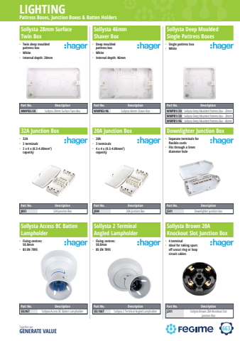 663LIGHTINGTogether we GENERATE VALUEhagerPattress Boxes, Junction Boxes & Batten HoldersSollysta 28mm Surface Twin BoxSollysta 46mm Shaver Box%u2022 Deep moulded pattress box%u2022 White%u2022 Internal depth: 46mmSollysta Deep Moulded Single Pattress BoxesPart No. DescriptionWMPB2/28 Sollysta 28mm Surface Twin BoxPart No. DescriptionWMPB2/46 Sollysta 46mm Shaver Box%u2022 Twin deep moulded pattress box%u2022 White%u2022 Internal depth: 28mm%u2022 Single pattress box%u2022 White32A Junction Box%u2022 20A%u2022 3 terminals%u2022 4 x 4 x (0.5-4.00mm2) capacity%u2022 32A%u2022 3 terminals%u2022 3 x 4 x (0.5-4.00mm2) capacity%u2022 Separate terminals for flexible cords%u2022 Fits through a 5mm diameter holeSollysta Access BC Batten LampholderSollysta 2 Terminal Angled Lampholder%u2022 Fixing centres: 50.8mm%u2022 BS EN 7895Sollysta Brown 20A Knockout Slot Junction Box%u2022 4 terminal%u2022 Ideal for taking spurs off uncut ring or loop circuit cablesPart No. DescriptionWMPB1/20 Sollysta Deep Moulded Pattress Box - 20mmWMPB1/28 Sollysta Deep Moulded Pattress Box - 28mmWMPB1/46 Sollysta Deep Moulded Pattress Box - 46mmPart No. DescriptionJ803 32A Junction BoxPart No. DescriptionJ804 20A Junction BoxPart No. DescriptionJ501 Downlighter junction boxPart No. DescriptionSEL96T Sollysta Access BC Batten LampholderPart No. DescriptionSEL106T Sollysta 2 Terminal Angled LampholderPart No. DescriptionJ201 Sollysta Brown 20A Knockout Slot Junction Box20A Junction Box Downlighter Junction Box%u2022 Fixing centres: 50.8mm%u2022 BS EN 7895
