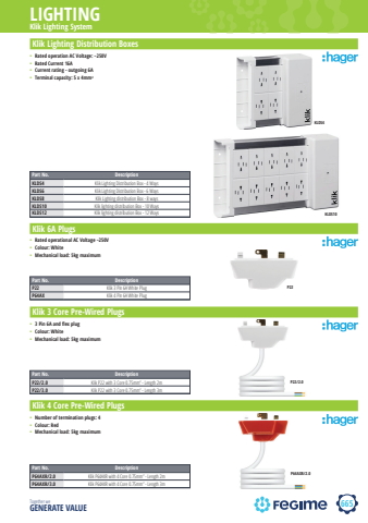 665LIGHTINGTogether we GENERATE VALUE%u2022 Rated operation AC Voltage: ~250V%u2022 Rated Current 16A%u2022 Current rating - outgoing 6A%u2022 Terminal capacity: 5 x 4mm2Part No. DescriptionKLDS4 Klik Lighting Distribution Box - 4 WaysKLDS6 Klik Lighting Distribution Box - 6 WaysKLDS8 Klik Lighting distribution Box - 8 waysKLDS10 Klik lighting distribution Box - 10 WaysKLDS12 Klik lighting distribution Box - 12 WaysPart No. DescriptionP22 Klik 3 Pin 6A White PlugP64AX Klik 4 Pin 6A White Plug %u2022 Rated operational AC Voltage ~250V%u2022 Colour: White%u2022 Mechanical load: 5kg maximumKLDS4Klik Lighting Distribution BoxesKlik 6A Plugs%u2022 3 Pin 6A and flex plug%u2022 Colour: White%u2022 Mechanical load: 5kg maximumPart No. DescriptionP22/2.0 Klik P22 with 3 Core 0.75mm2 - Length 2mP22/3.0 Klik P22 with 3 Core 0.75mm2 - Length 3mPart No. DescriptionP64AXR/2.0 Klik P64AXR with 4 Core 0.75mm2 - Length 2mP64AXR/3.0 Klik P64AXR with 4 Core 0.75mm2 - Length 3m%u2022 Number of termination plugs: 4%u2022 Colour: Red%u2022 Mechanical load: 5kg maximumKlik 3 Core Pre-Wired PlugsKlik 4 Core Pre-Wired PlugsKLDS10P22P64AXR/2.0P22/2.0Klik Lighting System
