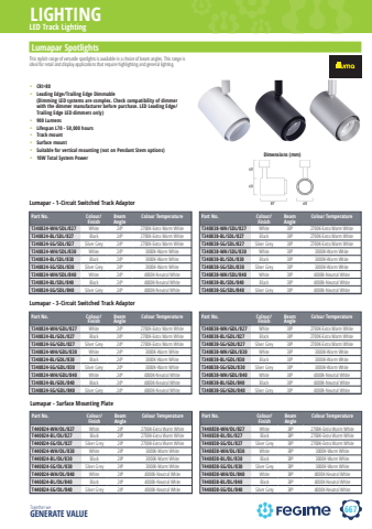 667LIGHTINGTogether we GENERATE VALUELED Track LightingLumapar Spotlights%u2022 CRI>80%u2022 Leading Edge/Trailing Edge Dimmable (Dimming LED systems are complex. Check compatibility of dimmer with the dimmer manufacturer before purchase. LED Leading Edge/Trailing Edge LED dimmers only)%u2022 900 Lumens%u2022 Lifespan L70 - 50,000 hours%u2022 Track mount%u2022 Surface mount%u2022 Suitable for vertical mounting (not on Pendant Stem options)%u2022 10W Total System PowerPart No. Colour/FinishBeam AngleColour TemperatureT340824-WH/SDL/827 White 24%u2070 2700K-Extra Warm WhiteT340824-BL/SDL/827 Black 24%u2070 2700K-Extra Warm WhiteT340824-SG/SDL/827 Silver Grey 24%u2070 2700K-Extra Warm WhiteT340824-WH/SDL/830 White 24%u2070 3000K-Warm WhiteT340824-BL/SDL/830 Black 24%u2070 3000K-Warm WhiteT340824-SG/SDL/830 Silver Grey 24%u2070 3000K-Warm WhiteT340824-WH/SDL/840 White 24%u2070 4000K-Neutral WhiteT340824-BL/SDL/840 Black 24%u2070 4000K-Neutral WhiteT340824-SG/SDL/840 Silver Grey 24%u2070 4000K-Neutral WhiteThis stylish range of versatile spotlights is available in a choice of beam angles. This range is ideal for retail and display applications that require highlighting and general lighting.Lumapar - 1-Circuit Switched Track AdaptorLumapar - 3-Circuit Switched Track AdaptorPart No. Colour/FinishBeam AngleColour TemperatureT340838-WH/SDL/827 White 38%u2070 2700K-Extra Warm WhiteT340838-BL/SDL/827 Black 38%u2070 2700K-Extra Warm WhiteT340838-SG/SDL/827 Silver Grey 38%u2070 2700K-Extra Warm WhiteT340838-WH/SDL/830 White 38%u2070 3000K-Warm WhiteT340838-BL/SDL/830 Black 38%u2070 3000K-Warm WhiteT340838-SG/SDL/830 Silver Grey 38%u2070 3000K-Warm WhiteT340838-WH/SDL/840 White 38%u2070 4000K-Neutral WhiteT340838-BL/SDL/840 Black 38%u2070 4000K-Neutral WhiteT340838-SG/SDL/840 Silver Grey 38%u2070 4000K-Neutral WhitePart No. Colour/FinishBeam AngleColour TemperatureT340824-WH/GDL/827 White 24%u2070 2700K-Extra Warm WhiteT340824-BL/GDL/827 Black 24%u2070 2700K-Extra Warm WhiteT340824-SG/GDL/827 Silver Grey 24%u2070 2700K-Extra Warm WhiteT340824-WH/GDL/830 White 24%u2070 3000K-Warm WhiteT340824-BL/GDL/830 Black 24%u2070 3000K-Warm WhiteT340824-SG/GDL/830 Silver Grey 24%u2070 3000K-Warm WhiteT340824-WH/GDL/840 White 24%u2070 4000K-Neutral WhiteT340824-BL/GDL/840 Black 24%u2070 4000K-Neutral WhiteT340824-SG/GDL/840 Silver Grey 24%u2070 4000K-Neutral WhitePart No. Colour/FinishBeam AngleColour TemperatureT340838-WH/GDL/827 White 38%u2070 2700K-Extra Warm WhiteT340838-BL/GDL/827 Black 38%u2070 2700K-Extra Warm WhiteT340838-SG/GDL/827 Silver Grey 38%u2070 2700K-Extra Warm WhiteT340838-WH/GDL/830 White 38%u2070 3000K-Warm WhiteT340838-BL/GDL/830 Black 38%u2070 3000K-Warm WhiteT340838-SG/GDL/830 Silver Grey 38%u2070 3000K-Warm WhiteT340838-WH/GDL/840 White 38%u2070 4000K-Neutral WhiteT340838-BL/GDL/840 Black 38%u2070 4000K-Neutral WhiteT340838-SG/GDL/840 Silver Grey 38%u2070 4000K-Neutral WhiteLumapar - Surface Mounting PlatePart No. Colour/FinishBeam AngleColour TemperatureT440824-WH/DL/827 White 24%u2070 2700K-Extra Warm WhiteT440824-BL/DL/827 Black 24%u2070 2700K-Extra Warm WhiteT440824-SG/DL/827 Silver Grey 24%u2070 2700K-Extra Warm WhiteT440824-WH/DL/830 White 24%u2070 3000K-Warm WhiteT440824-BL/DL/830 Black 24%u2070 3000K-Warm WhiteT440824-SG/DL/830 Silver Grey 24%u2070 3000K-Warm WhiteT440824-WH/DL/840 White 24%u2070 4000K-Neutral WhiteT440824-BL/DL/840 Black 24%u2070 4000K-Neutral WhiteT440824-SG/DL/840 Silver Grey 24%u2070 4000K-Neutral WhitePart No. Colour/FinishBeam AngleColour TemperatureT440838-WH/DL/827 White 38%u2070 2700K-Extra Warm WhiteT440838-BL/DL/827 Black 38%u2070 2700K-Extra Warm WhiteT440838-SG/DL/827 Silver Grey 38%u2070 2700K-Extra Warm WhiteT440838-WH/DL/830 White 38%u2070 3000K-Warm WhiteT440838-BL/DL/830 Black 38%u2070 3000K-Warm WhiteT440838-SG/DL/830 Silver Grey 38%u2070 3000K-Warm WhiteT440838-WH/DL/840 White 38%u2070 4000K-Neutral WhiteT440838-BL/DL/840 Black 38%u2070 4000K-Neutral WhiteT440838-SG/DL/840 Silver Grey 38%u2070 4000K-Neutral WhiteDimensions (mm)