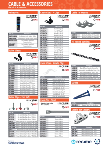 CABLE & ACCESSORIES67 Together we GENERATE VALUEElectrical AccessoriesAdhesivesPart No. DescriptionBTKFPIA300W Fire Resistant Acrylic Sealant - 300mlBTKFPS300W Fire Retardant Silicone Sealant - 300mlBUK30811859 Fire Retardant Hand Held Expanding FoamSXFLAMEFF700HANDFire Retardant Hand Held Expanding FoamCable CleatsPart No. DescriptionQC10MBK Metal Cable Cleats 22.7-25.4mmQC11MBK Metal Cable Cleats 25.3-27.7mmQC12MBK Metal Cable Cleats 27.6-30.5mmQC14MBK Metal Cable Cleats 30.4-35.5mmQC16MBK Metal Cable Cleats 35.4-40.6mmQC18MBK Metal Cable Cleats 40.5-45.7mmQC20MBK Metal Cable Cleats 45.6-50.8mmQC3MBK Metal Cable Cleats 5.0-7.6mmQC4MBK Metal Cable Cleats 7.7-10.0mmQC5MBK Metal Cable Cleats 10.1-12.7mmQC6MBK Metal Cable Cleats 12.6-15.2mmQC7MBK Metal Cable Cleats 15.1-17.8mmQC8MBK Metal Cable Cleats 17.7-20.3mmQC9MBK Metal Cable Cleats 20.2-22.8mmCable Clips - Fire SafePart No. DescriptionQFGFC25 Fire-Safe Cable Clips 25mm (120Min)QFGFC40 Fire-Safe Cable Clips 40mm (120Min)QFGFC50 Fire-Safe Cable Clips 50mm (120Min)QMC25 Metal Cable Clips for 1.0-2.5mm%u00b2 T&E Cable QMC25GY Metal LSF Cable Clips for 1.0-2.5mm%u00b2 T&E Cable QMC25RD Metal LSF Cable Clips for 1.0-2.5mm%u00b2 T&E Cable QMC25WH Metal LSF Cable Clips for 1.0-2.5mm%u00b2 T&E Cable QMC6 Metal Cable Clip for 4-6mm%u00b2 T&E CableQMC6GY Metal LSF Cable Clip for 4-6mm%u00b2 T&E CableQMC6RD Metal LSF Cable Clip for 4-6mm%u00b2 T&E CableQMC6WH Metal LSF Cable Clip for 4-6mm%u00b2 T&E CableCable Clips - P ClipsPart No. DescriptionQPC28LSFB Black 28 P Clip LSFQPC28LSFR Red 28 P Clip LSFQPC28LSFW White 28 P Clip LSFQPC30LSFB Black 30 P Clip LSFQPC30LSFR Red 30 P Clip LSFQPC30LSFW White 30 P Clip LSFQPC32LSFB Black 32 P Clip LSFQPC32LSFR Red 32 P Clip LSFQPC32LSFW White 32 P Clip LSFQPC34LSFB Black 34 P Clip LSFQPC34LSFR Red 34 P Clip LSFQPC34LSFW White 34 P Clip LSFQPC37LSFB Black 37 P Clip LSFQPC37LSFR Red 37 P Clip LSFQPC37LSFW White 37 P Clip LSFCable Clips - Saddle ClipsPart No. DescriptionQSC302LSFB Black 302 Saddle Clip LSFQSC302LSFR Red 302 Saddle Clip LSFQSC302LSFW White 302 Saddle Clip LSFQSC342LSFB Black 342 Saddle Clip LSFQSC342LSFR Red 342 Saddle Clip LSFQSC342LSFW White 342 Saddle Clip LSFQSC382LSFB Black 382 Saddle Clip LSFQSC382LSFR Red 382 Saddle Clip LSFQSC382LSFW White 382 Saddle Clip LSFCable Tie - SteelPart No. DescriptionQSST150S 150mm x 4.6mmQSST200S 200mm x 4.6mm QSST300S 300mm x 4.6mm QSST360S 360mm x 4.6mm QSST520S 520mm x 4.6mm QSST300LH 300mm x 7.9mm QSST360LH 360mm x 7.9mm QSST520LH 520mm x 7.9mm QSST840LH 840mm x 7.9mm %u2022 Stainless Steel Roller Ball Cable TiesCable Tie MountsPart No. DescriptionQSSTM-4 Stainless Steel Cable Tie Mount M4QSSTM-6 Stainless Steel Cable Tie Mount M6All Round BandingPart No. DescriptionQARB12B Black All-Round Banding 12mm x 10mQARB12G Galvanised All-Round Banding 12mm x 10mQARB12R Red All-Round Banding 12mm x 10mQARB12W White All-Round Banding 12mm x 10mQARB17B Black All-Round Banding 17mm x 10mQARB17G Galvanised All-Round Banding 17mm x 10mScrewsPart No. DescriptionQMA48-40 Masonry Fixing Screw 4.8 x 40mmSaddle Bar SpacersPart No. DescriptionQSBS20 Metal Saddle Bar Spacer 20mmQSBS20W Metal Saddle Bar Spacer 20mmQSBS25 Metal Saddle Bar Spacer 25mmQSBS25W Metal Saddle Bar Spacer 25mm
