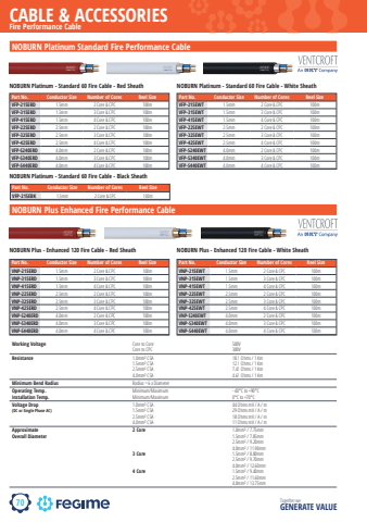 70CABLE & ACCESSORIESTogether we GENERATE VALUEFire Performance CableNOBURN Platinum Standard Fire Performance CablePart No. Conductor Size Number of Cores Reel SizeVFP-215ERD 1.5mm 2 Core & CPC 100mVFP-315ERD 1.5mm 3 Core & CPC 100mVFP-415ERD 1.5mm 4 Core & CPC 100mVFP-225ERD 2.5mm 2 Core & CPC 100mVFP-325ERD 2.5mm 3 Core & CPC 100mVFP-425ERD 2.5mm 4 Core & CPC 100mVFP-S240ERD 4.0mm 2 Core & CPC 100mVFP-S340ERD 4.0mm 3 Core & CPC 100mVFP-S440ERD 4.0mm 4 Core & CPC 100mWorking Voltage Core to Core 500VCore to CPC 300VResistance 1.0mm%u00b2 CSA 18.1 Ohms / 1 Km1.5mm%u00b2 CSA 12.1 Ohms / 1 Km2.5mm%u00b2 CSA 7.41 Ohms / 1 Km4.0mm%u00b2 CSA 4.61 Ohms / 1 KmMinimum Bend Radius Radius = 6 x DiameterOperating Temp. Minimum/Maximum - 40%u00b0C to +90%u00b0CInstallation Temp. Minimum/Maximum 0%u00b0C to +70%u00b0CVoltage Drop 1.0mm%u00b2 CSA 44 Ohms mV / A / m(DC or Single Phase AC) 1.5mm%u00b2 CSA 29 Ohms mV / A / m2.5mm%u00b2 CSA 18 Ohms mV / A / m4.0mm%u00b2 CSA 11 Ohms mV / A / mApproximate 2 Core 1.0mm%u00b2 / 7.75mmOverall Diameter 1.5mm%u00b2 / 7.85mm2.5mm%u00b2 / 9.20mm4.0mm%u00b2 / 11.90mm3 Core 1.5mm%u00b2 / 8.80mm2.5mm%u00b2 / 9.70mm4.0mm%u00b2 / 12.60mm4 Core 1.5mm%u00b2 / 9.40mm2.5mm%u00b2 / 11.60mm4.0mm%u00b2 / 13.75mmPart No. Conductor Size Number of Cores Reel SizeVFP-215EWT 1.5mm 2 Core & CPC 100mVFP-315EWT 1.5mm 3 Core & CPC 100mVFP-415EWT 1.5mm 4 Core & CPC 100mVFP-225EWT 2.5mm 2 Core & CPC 100mVFP-325EWT 2.5mm 3 Core & CPC 100mVFP-425EWT 2.5mm 4 Core & CPC 100mVFP-S240EWT 4.0mm 2 Core & CPC 100mVFP-S340EWT 4.0mm 3 Core & CPC 100mVFP-S440EWT 4.0mm 4 Core & CPC 100mPart No. Conductor Size Number of Cores Reel SizeVFP-215EBK 1.5mm 2 Core & CPC 100mNOBURN Platinum - Standard 60 Fire Cable - Red Sheath NOBURN Platinum - Standard 60 Fire Cable - White SheathNOBURN Platinum - Standard 60 Fire Cable - Black SheathPart No. Conductor Size Number of Cores Reel SizeVNP-215ERD 1.5mm 2 Core & CPC 100mVNP-315ERD 1.5mm 3 Core & CPC 100mVNP-415ERD 1.5mm 4 Core & CPC 100mVNP-225ERD 2.5mm 2 Core & CPC 100mVNP-325ERD 2.5mm 3 Core & CPC 100mVNP-425ERD 2.5mm 4 Core & CPC 100mVNP-S240ERD 4.0mm 2 Core & CPC 100mVNP-S340ERD 4.0mm 3 Core & CPC 100mVNP-S440ERD 4.0mm 4 Core & CPC 100mPart No. Conductor Size Number of Cores Reel SizeVNP-215EWT 1.5mm 2 Core & CPC 100mVNP-315EWT 1.5mm 3 Core & CPC 100mVNP-415EWT 1.5mm 4 Core & CPC 100mVNP-225EWT 2.5mm 2 Core & CPC 100mVNP-325EWT 2.5mm 3 Core & CPC 100mVNP-425EWT 2.5mm 4 Core & CPC 100mVNP-S240EWT 4.0mm 2 Core & CPC 100mVNP-S340EWT 4.0mm 3 Core & CPC 100mVNP-S440EWT 4.0mm 4 Core & CPC 100mNOBURN Plus - Enhanced 120 Fire Cable - Red Sheath NOBURN Plus - Enhanced 120 Fire Cable - White SheathNOBURN Plus Enhanced Fire Performance Cable