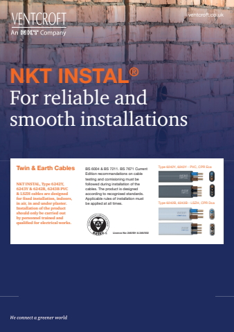 Twin & Earth CablesNKT INSTAL, Type 6242Y, 6243Y & 6242B, 6243B PVC& LSZH cables are designed for fixed installation, indoors, in air, in and under plaster. Installation of the product should only be carried out by personnel trained and qualified for electrical works.BS 6004 & BS 7211. BS 7671 Current Edition recommandations on cable testing and comisioning must be followed during installation of the cables. The product is designed according to recognised standards. Applicable rules of installation must be applied at all times. Cert/LPCB ref.:Licence No: 246/001 & 246/002Type 6242Y, 6243Y - PVC, CPR EcaType 6242B, 6243B - LSZH, CPR DcaNKT INSTAL%u00aeFor reliable and smooth installations ventcroft.co.uk