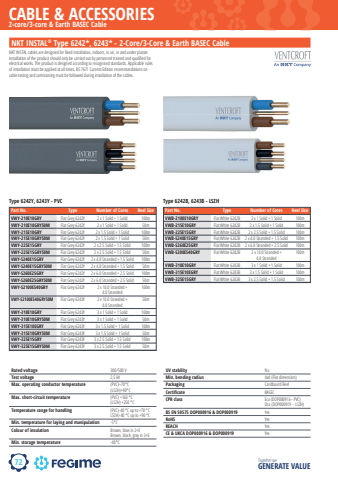 72CABLE & ACCESSORIESTogether we GENERATE VALUE2-core/3-core & Earth BASEC CableNKT INSTAL%u00ae Type 6242*, 6243* - 2-Core/3-Core & Earth BASEC CableNKT INSTAL cables are designed for fi xed installation, indoors, in air, in and under plaster. Installation of the product should only be carried out by personnel trained and qualifi ed for electrical works. The product is designed according to recognised standards. Applicable rules of installation must be applied at all times. BS 7671 Current Edition recommandations on cable testing and comisioning must be followed during installation of the cables.Part No. Type Number of Cores Reel SizeVWY-210E10GRY Flat Grey 6242Y 2 x 1 Solid + 1 Solid 100mVWY-210E10GRY50M Flat Grey 6242Y 2 x 1 Solid + 1 Solid 50mVWY-215E10GRY Flat Grey 6242Y 2 x 1.5 Solid + 1 Solid 100mVWY-215E10GRY50M Flat Grey 6242Y 2 x 1.5 Solid + 1 Solid 50mVWY-225E15GRY Flat Grey 6242Y 2 x 2.5 Solid + 1.5 Solid 100mVWY-225E15GRY50M Flat Grey 6242Y 2 x 2.5 Solid + 1.5 Solid 50mVWY-S240E15GRY Flat Grey 6242Y 2 x 4.0 Stranded + 1.5 Solid 100mVWY-S240E15GRY50M Flat Grey 6242Y 2 x 4.0 Stranded + 1.5 Solid 50mVWY-S260E25GRY Flat Grey 6242Y 2 x 6.0 Stranded + 2.5 Solid 100mVWY-S260E25GRY50M Flat Grey 6242Y 2 x 6.0 Stranded + 2.5 Solid 50mVWY-S2100ES40GRY Flat Grey 6242Y 2 x 10.0 Stranded + 4.0 Stranded100mVWY-S2100ES40GRY50M Flat Grey 6243Y 2 x 10.0 Stranded + 4.0 Stranded50mVWY-310E10GRY Flat Grey 6243Y 3 x 1 Solid + 1 Solid 100mVWY-310E10GRY50M Flat Grey 6243Y 3 x 1 Solid + 1 Solid 50mVWY-315E10EGRY Flat Grey 6243Y 3 x 1.5 Solid + 1 Solid 100mVWY-315E10GRY50M Flat Grey 6243Y 3 x 1.5 Solid + 1 Solid 50mVWY-325E15GRY Flat Grey 6243Y 3 x 2.5 Solid + 1.5 Solid 100mVWY-325E15GRY50M Flat Grey 6243Y 3 x 2.5 Solid + 1.5 Solid 50mType 6242Y, 6243Y - PVCPart No. Type Number of Cores Reel SizeVWB-2100E10GRY Flat White 6242B 2 x 1 Solid + 1 Solid 100mVWB-215E10GRY Flat White 6242B 2 x 1.5 Solid + 1 Solid 100mVWB-225E15GRY Flat White 6242B 2 x 2.5 Solid + 1.5 Solid 100mVWB-S240E15GRY Flat White 6242B 2 x 4.0 Stranded + 1.5 Solid 100mVWB-S260E25GRY Flat White 6242B 2 x 6.0 Stranded + 2.5 Solid 100mVWB-S200ES40GRY Flat White 6242B 2 x 10.0 Stranded + 4.0 Stranded100mVWB-310E10GRY Flat White 6243B 3 x 1 Solid + 1 Solid 100mVWB-315E10EGRY Flat White 6243B 3 x 1.5 Solid + 1 Solid 100mVWB-325E15GRY Flat White 6243B 3 x 2.5 Solid + 1.5 Solid 100mType 6242B, 6243B - LSZHRated voltage 300/500 VTest voltage 2,5 kVMax. operating conductor temperature (PVC)+70%u00b0C(LSZH)+90%u00b0CMax. short-circuit temperature (PVC) +160 %u00b0C(LSZH) +250 %u00b0CTemperature range for handling (PVC)-40 %u00b0C up to +70 %u00b0CLSZH)-40 %u00b0C up to +90 %u00b0CMin. temperature for laying and manipulation -5%u00b0CColour of insulation Brown, blue in 2+EBrown, black, grey in 3+EMin. storage temperature -40%u00b0CUV stability NoMin. bending radius 4xd (Flat dimension)Packaging Cardboard ReelCertifi cate BASECCPR class Eca (DOP000916 - PVC)Dca (DOP000919 %u2013 LSZH)BS EN 50575 DOP000916 & DOP000919 YesRoHS YesREACH YesCE & UKCA DOP000916 & DOP000919 YesType 6242B, 6243B - LSZH, CPR DcaType 6242Y, 6243Y - PVC, CPR EcaType 6242B, 6243B - LSZH, CPR Dca
