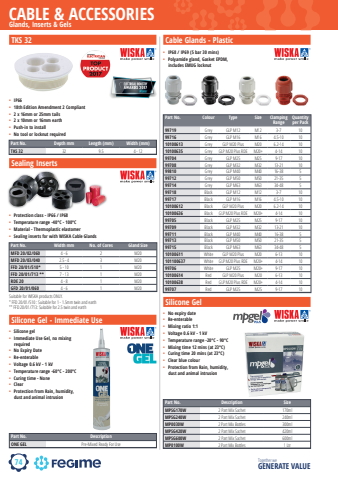 74CABLE & ACCESSORIESTogether we GENERATE VALUEmpgelone gelwiskaGlands, Inserts & GelsTKS 32Part No. Depth mm Length (mm) Width (mm)TKS 32 32 9.5 4 - 12Sealing InsertsCable Glands - PlasticSilicone GelSilicone Gel - Immediate Use%u2022 Protection class - IP66 / IP68%u2022 Temperature range -40%u00b0C - 100%u00b0C%u2022 Material - Thermoplastic elastomer%u2022 Sealing inserts for with WISKA Cable Glands%u2022 IP68 / IP69 (5 bar 30 mins)%u2022 Polyamide gland, Gasket EPDM, includes EMUG locknutPart No. Width mm No. of Cores Gland SizeMFD 20/02/060 4 - 6 2 M20MFD 20/03/040 2.5 - 4 3 M20FFD 20/01/510* 5 - 10 1 M20FFD 20/01/713 ** 7 - 13 1 M20RDE 20 4 - 8 1 M20GFD 20/01/060 4 - 6 1 M20Suitable for WISKA products ONLY. * FFD 20/01/510 : Suitable for 1 - 1.5mm twin and earth ** FFD 20/01/713: Suitable for 2.5 twin and earth%u2022 IP66%u2022 18th Edition Amendment 2 Compliant%u2022 2 x 16mm or 25mm tails%u2022 2 x 10mm or 16mm earth%u2022 Push-in to install%u2022 No tool or locknut requiredPart No. Colour Type Size Clamping RangeQuantity per Pack99719 Grey GLP M12 M12 3-7 1099716 Grey GLP M16 M16 4.5-10 1010100613 Grey GLP M20 Plus M20 6.2-14 1010100635 Grey GLP M20 Plus RDE M20+ 4-14 1099704 Grey GLP M25 M25 9-17 1099708 Grey GLP M32 M32 13-21 1099810 Grey GLP M40 M40 16-38 599712 Grey GLP M50 M50 21-35 599714 Grey GLP M63 M63 34-48 599718 Black GLP M12 M12 3-7 1099717 Black GLP M16 M16 4.5-10 1010100612 Black GLP M20 Plus M20 6.2-14 1010100636 Black GLP M20 Plus RDE M20+ 4-14 1099705 Black GLP M25 M25 9-17 1099709 Black GLP M32 M32 13-21 1099711 Black GLP M40 M40 16-38 599713 Black GLP M50 M50 21-35 599715 Black GLP M63 M63 34-48 510100611 White GLP M20 Plus M20 6-13 10101100637 White GLP M20 Plus RDE M20+ 4-14 1099706 White GLP M25 M20+ 9-17 1010100614 Red GLP M20 Plus M20 6-13 1010100638 Red GLP M20 Plus RDE M20+ 4-14 1099707 Red GLP M25 M25 9-17 10Part No. Description SizeMPSG170W 2 Part Mix Sachet 170mlMPSG240W 2 Part Mix Sachet 240mlMP0030W 2 Part Mix Bottles 300mlMPSG420W 2 Part Mix Sachet 420mlMPSG600W 2 Part Mix Sachet 600mlMP0100W 2 Part Mix Bottles 1 Ltr%u2022 No expiry date%u2022 Re-enterable%u2022 Mixing ratio 1:1%u2022 Voltage 0.6 kV - 1 kV%u2022 Temperature range -20%u00b0C - 90%u00b0C%u2022 Mixing time 12 mins (at 23%u00b0C)%u2022 Curing time 20 mins (at 23%u00b0C)%u2022 Clear blue colour%u2022 Protection from Rain, humidity, dust and animal intrusionPart No. DescriptionONE GEL Pre-Mixed Ready For Use%u2022 Silicone gel%u2022 Immediate Use Gel, no mixing required%u2022 No Expiry Date%u2022 Re-enterable%u2022 Voltage 0.6 kV - 1 kV%u2022 Temperature range -60%u00b0C - 200%u00b0C%u2022 Curing time - None%u2022 Clear%u2022 Protection from Rain, humidity, dust and animal intrusion