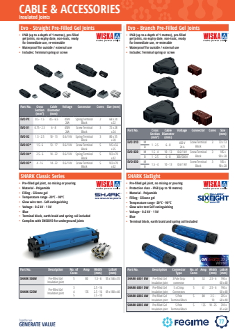 77CABLE & ACCESSORIESTogether we GENERATE VALUEsixeightSHARK Classic Series SHARK SixEight%u2022 Pre-filled gel joint, no mixing or pouring %u2022 Material - Polyamide%u2022 Filling - Silicone gel%u2022 Temperature range -20%u00b0C - 90%u00b0C%u2022 Glow wire test - Self-extinguishing%u2022 Voltage - 0.6 kV - 1 kV%u2022 Blue%u2022 Terminal block, earth braid and spring coil included%u2022 Complies with EN50393 for underground jointsPart No. Description No. of CoresAmp Width (mm)LxBxH (mm)SHARK 506W Pre-fi lled Gel Insulation Joint5 80 1.5 - 6 55 x 146 x 35SHARK 525W Pre-fi lled Gel Insulation Joint3451352.5 - 162.5 - 162.5 - 1069 x 180 x 40%u2022 Pre-filled gel joint, no mixing or pouring %u2022 Protection class - IP68 (up to 10 metres)%u2022 Material - Polyamide%u2022 Filling - Silicone gel%u2022 Temperature range -20%u00b0C - 90%u00b0C%u2022 Glow wire test Self-extinguishing%u2022 Voltage - 0.6 kV - 1 kV%u2022 Blue%u2022 Terminal block, earth braid and spring coil includedPart No. Description Connector TypeNo. of CoresAmp Width (mm)LxBxH (mm)SHARK 6801 BW Pre-fi lled Gel Insulation Joint3 Pole Strip connector3 32 2.5 - 6 190 x 60 x 48SHARK 6801 DW Pre-fi lled Gel Insulation Joint5 x Crimp Connectors5 41 2.5 - 6 190 x 60 x 48SHARK 6802 AW Pre-fi lled Gel Insulation Joint5 Pole Terminal Block5 80 2.5 - 10235 x 68 x 48SHARK 6803 AW Pre-fi lled Gel Insulation Joint5 Pole Terminal Block5 135 10 - 25 310 x 85 x 60Insulated JointsEvo - Straight Pre-Filled Gel Joints Evo - Branch Pre-Filled Gel Joints%u2022 IP68 (up to a depth of 1 metres), pre-filled gel joints, no expiry date, non-toxic, ready for immediate use, re-enterable%u2022 Waterproof for outside / external use%u2022 Includes: Terminal spring or screw%u2022 IP68 (up to a depth of 1 metres), pre-filled gel joints, no expiry date, non-toxic, ready for immediate use, re-enterable%u2022 Waterproof for outside / external use%u2022 Includes: Terminal spring or screwPart No. Cross Section (mm2)Cable Diameter (mm)Voltage Connector Cores Size (mm)EVO PX 0.5 - 1.5 4.5 - 6.5 450V24ASpring TerminalBlock2 68 x 24 x 22EVO 01 0.75 - 2.5 6 - 8 450V24AScrew TerminalBlock3 72 x 28 x 24EVO 02 1.5 - 2.5 10 - 13 0.6/1 kV Spring TerminalBlock3 80 x 35 x 28EVO 03* 1.5 - 6 13 - 17 0.6/1 kV Screw TerminalBlock5 145 x 56 x 35EVO 04* 2.5 - 6 14 - 22 0.6/1 kV Spring TerminalBlock5 183 x 70 x 42EVO 05* 4 - 16 14 - 22 0.6/1 kV Screw TerminalBlock5 183 x 70 x 42Part No. Cross Section (mm2)Cable Diameter (mm)Voltage Connector Cores Size (mm)EVO 01D M 1 - 2.5 6 - 8 450 V24 AScrew TerminalBlock3 73 x 73 x 23 BEVO 02D M 1.5 - 4 10 - 13 0.6/1 kV Screw TerminalBlock3 105 x 90 x 28 B 1 - 2.5 6 - 8 300/500 VEVO 03D M 1.5 - 4 10 - 13 0.6/1 kV Screw TerminalBlock3 105 x 90 x 28 B