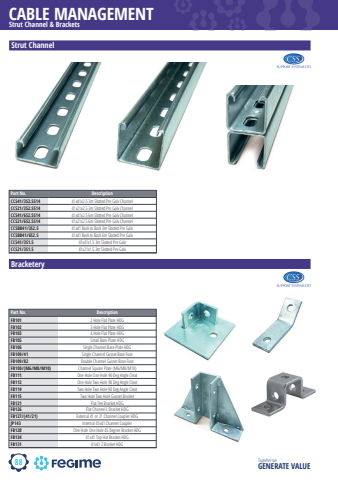 88CABLE MANAGEMENTTogether we GENERATE VALUECSSStrut Channel Part No. DescriptionCCS41/3S2.5S14 41x41x2.5 3m Slotted Pre Galv ChannelCCS21/3S2.5S14 41x21x2.5 3m Slotted Pre Galv Channel CCS41/6S2.5S14 41x41x2.5 6m Slotted Pre Galv Channel CCS21/6S2.5S14 41x21x2.5 6m Slotted Pre Galv Channel CCSBB41/3S2.5 41x41 Back to Back 3m Slotted Pre Galv CCSBB41/6S2.5 41x41 Back to Back 6m Slotted Pre Galv CCS41/3S1.5 41x41x1.5 3m Slotted Pre Galv CCS21/3S1.5 41x21x1.5 3m Slotted Pre Galv BracketeryPart No. DescriptionFB101 2 Hole Flat Plate HDGFB102 3 Hole Flat Plate HDGFB103 4 Hole Flat Plate HDGFB105 Small Base Plate HDGFB106 Single Channel Base Plate HDG FB109/41 Single Channel Gusset Base FootFB109/82 Double Channel Gusset Base FootFB100/(M6/M8/M10) Channel Square Plate (M6/M8/M10)FB111 One Hole One Hole 90 Deg Angle Cleat FB112 One Hole Two Hole 90 Deg Angle Cleat FB114 Two Hole Two Hole 90 Deg Angle CleatFB115 Two Hole Two Hole Gusset BracketFB121 Flat Tee Bracket HDGFB126 Flat Channel L Bracket HDGFB127/(41/21) External 41 or 21 Channel Coupler HDGJP143 Internal 41x41 Channel CouplerFB128 One Hole One Hole 45 Degree Bracket HDGFB134 41x41 Top Hat Bracket HDGFB131 41x41 Z Bracket HDGStrut Channel & Brackets