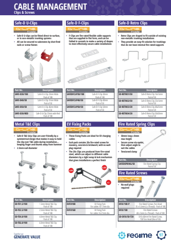 97CABLE MANAGEMENTTogether we GENERATE VALUESafe-D U-Clips%u2022 Safe-D U-clips can be fitted direct-to-surface, or in non-metallic trunking systems%u2022 All can be secured to substrates by shot-fired nails or screw-fixingsPart No. DescriptionSAFE-D30/100 Safe-D U-Clip 23mm Wide Pack of 100SAFE-D40/50 Safe-D U-Clip 31mm Wide Pack of 50SAFE-D50/50 Safe-D U-Clip 46mm Wide Pack of 50SAFE-D30/RED Safe-D U-Clip 23mm wide Red Pack of 100Part No. DescriptionSAFEDFCLIP30/100 Safe-D F-Clip 30mm Pack of 100SAFEDFCLIP40/50 Safe-D F-Clip 40mm Pack of 50SAFEDFCLIP50/50 Safe-D F-Clip 50mm Pack of 50Part No. DescriptionSD-RETRO1/50 Safe-D Retro Clip 16x16mm Pack of 50SD-RETRO2/50 Safe-D Retro Clip 25x16mmPack of 50SD-RETRO3/20 Safe-D Retro Clip 40x25mm Pack of 20SD-RETRO4/20 Safe-D Retro Clip 50x50mm Pack of 20Safe-D F-Clips%u2022 F-Clips are fire-rated flexible cable supports that are supplied in flat form, and can be folded in seconds to make a variety of shapes to most effectively secure cable installationsSafe-D Retro Clips%u2022 Retro Clips are shaped to fit outside of existing non-metallic trunking installations%u2022 They provide an easy-fit solution for trunkings that do not have internal fire-rated supportsMetal T&E ClipsPart No. DescriptionSD-TE1.5/100 1.5mm Metal T&E ClipPack of 100SD-TE2.5/100 2.5mm Metal T&E ClipPack of 100SD-TE4.0/100 4.0mm Metal T&E ClipPack of 100SD-TE6.0/100 6.0mm Metal T&E ClipPack of 100EV Fixing PacksPart No. DescriptionEVFIX10B EV Fixing Pack For cables 10-17mm diaEVFIX16B EV Fixing Pack For cables 16-21mm dia.%u2022 These Fixing Packs are ideal for EV charging cables%u2022 Each pack contains 20x fire-rated screws for masonry, concrete & brickwork; with no wallplug required%u2022 The 20x Clips are produced from fire-rated steel, which can adjust to different cable diameters by a tight wrap & lock mechanism that gives installations a perfect finish%u2022 Safe-D T&E Grip Clips are user-friendly by a symmetrical design that makes it easy to hold the clip over T&E cable during installation%u2026 keeping finger and thumb away from hammer%u2022 2.5mm nail diameterFire Rated ScrewsPart No. DescriptionDFIX/100-P Fire Rated Screws, Pan-Head 35 x 5.5mm (L x Thread) - Pack of 100DFIX/100 Fire Rated Screws 40 x 5mm (L x Thread) - Pack of 100SD-DFIX/50-T30 D-Fix 60mm Fire Rated Screw, T30 Torx Head (Box of 50)Fire Rated Spring ClipsPart No. DescriptionSAFEDSPRING/50 Fire-Rated Spring Clip Pack of 50Clips & Screws%u2022 50mm long x 8mm max height%u2022 Secure screw via eyelet, then adjust angle to suit the cables%u2022 Tensioned clamp%u2022 No wall plugs required
